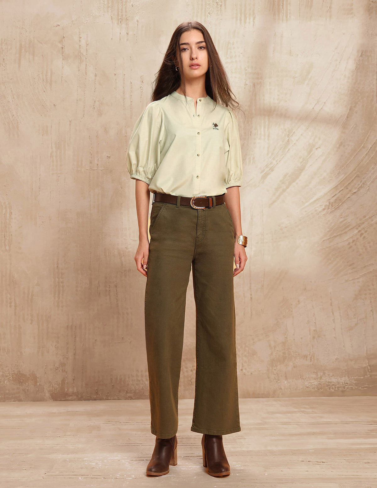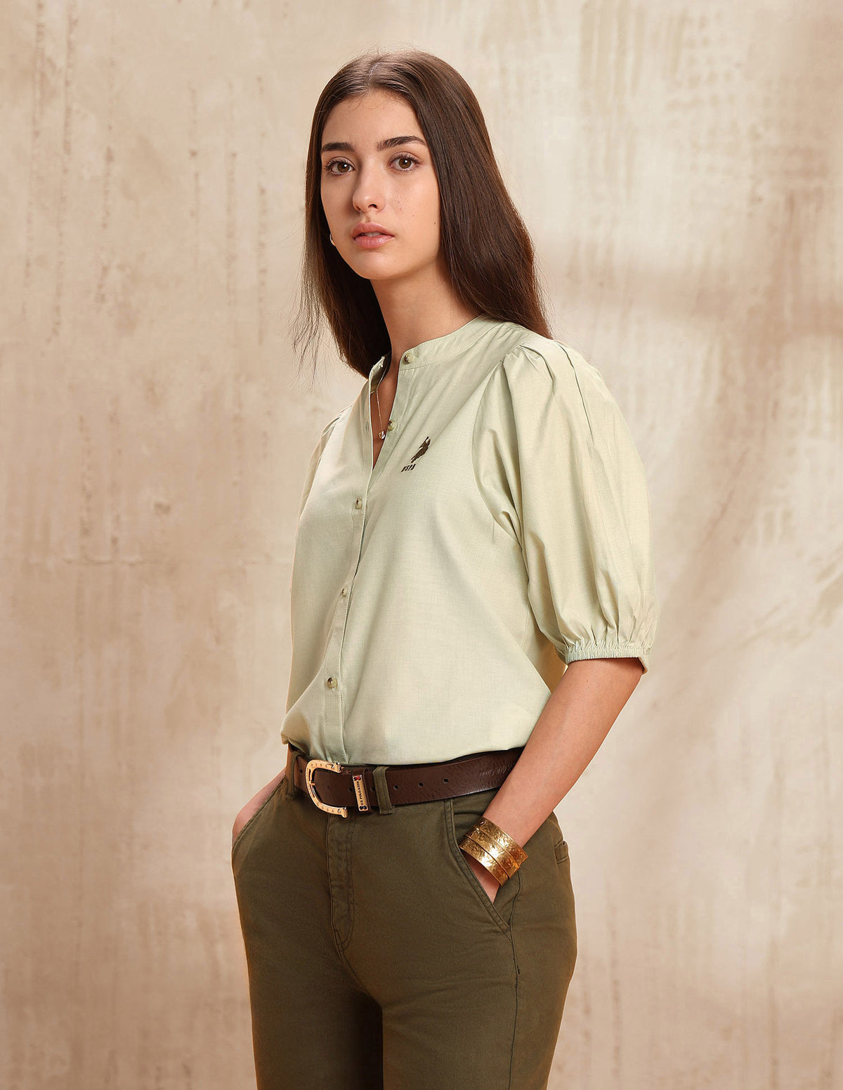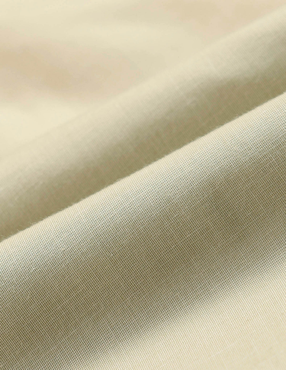 | Mandarin collar | Full button placket | Short sleeves with elasticized hems | Straight hemline | Solid pattern | Regular weave | Regular fit |