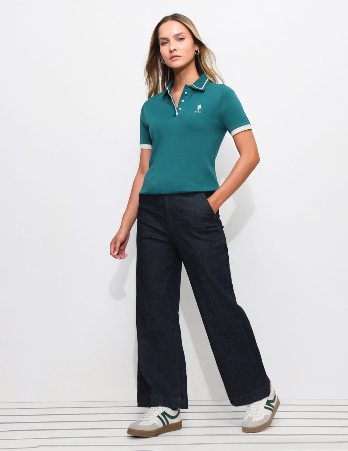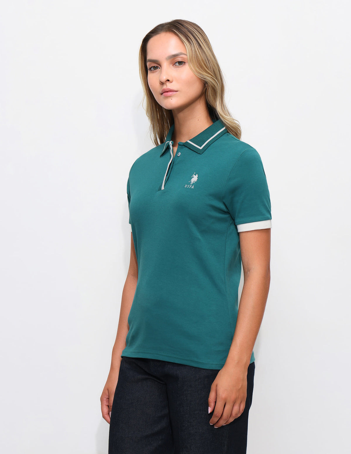 | Polo collar | Logo at chest | Short button placket | Short sleeves | Ribbed collar and sleeve hems | Even vented hem | Solid pattern | Pique knit | Regular fit