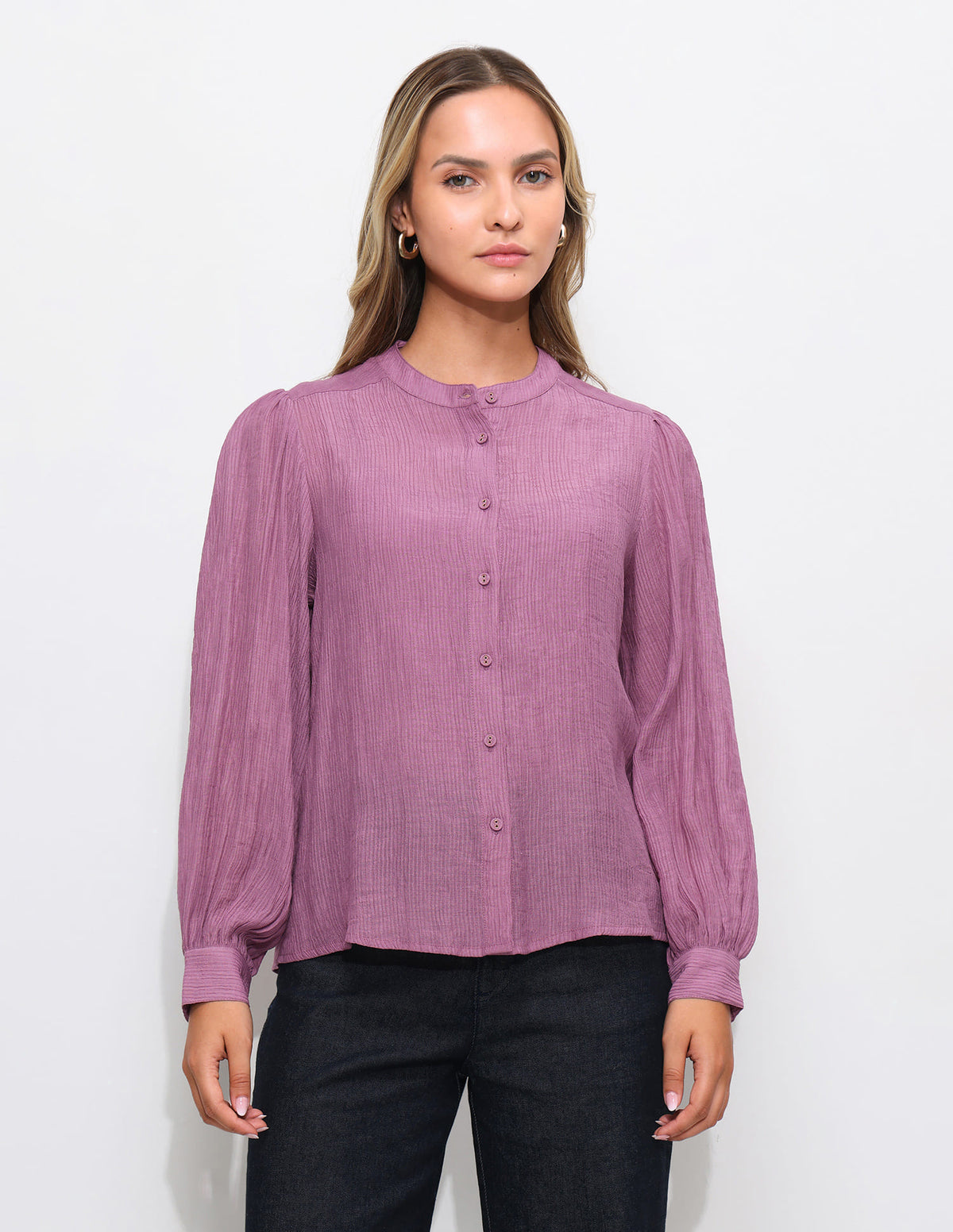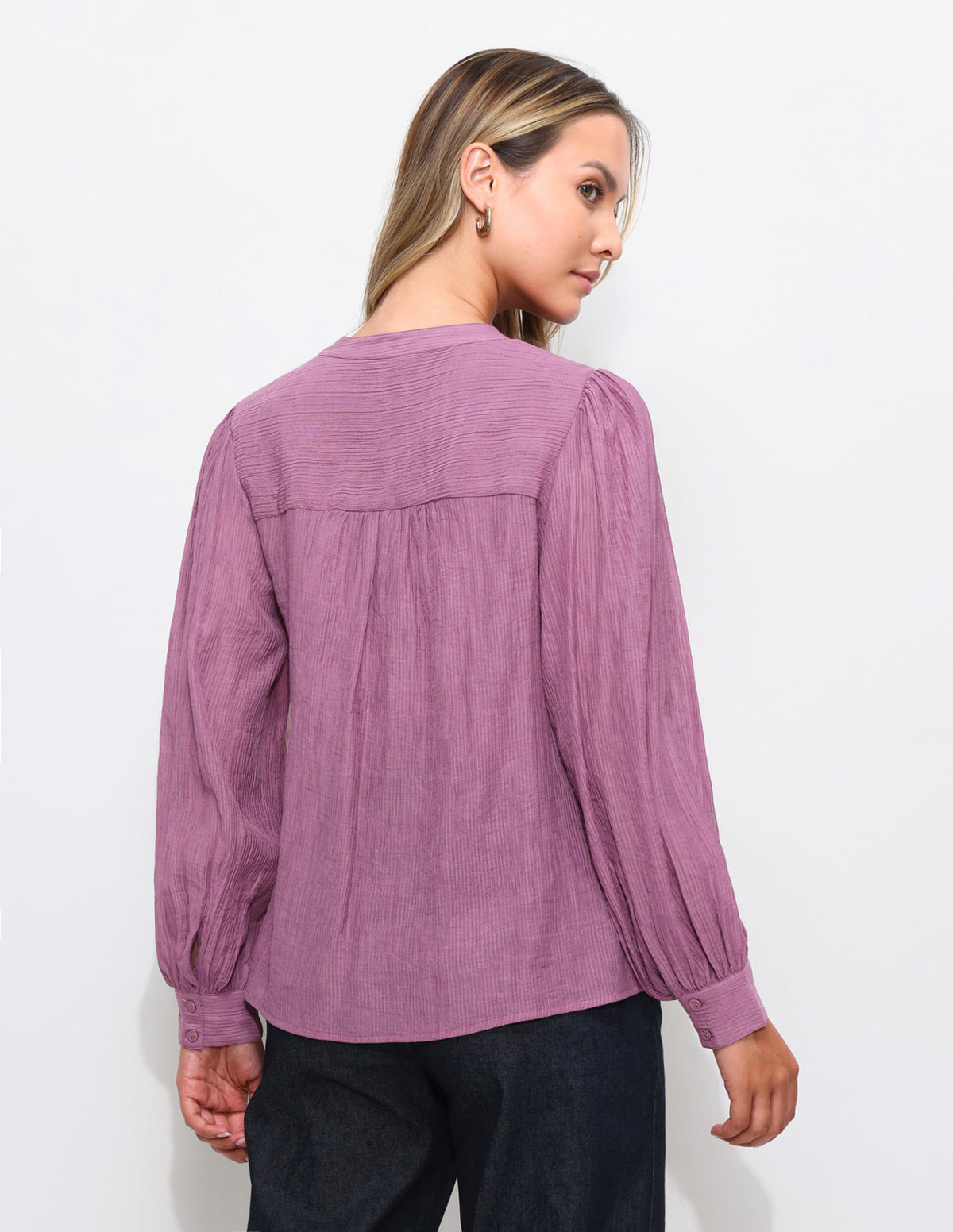 | Mandarian collar | Gatheres at shoulder | Button closure | Long sleeves with elasticized hems | Straight hemline | Solid pattern | Regular weave | Relaxed fit | Country Of Origin - India