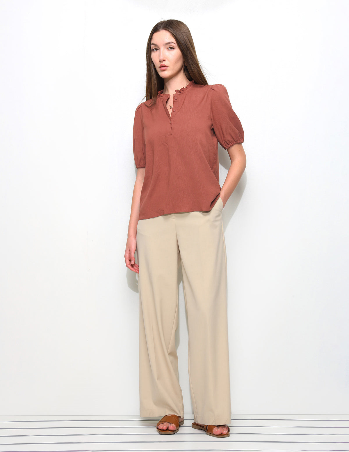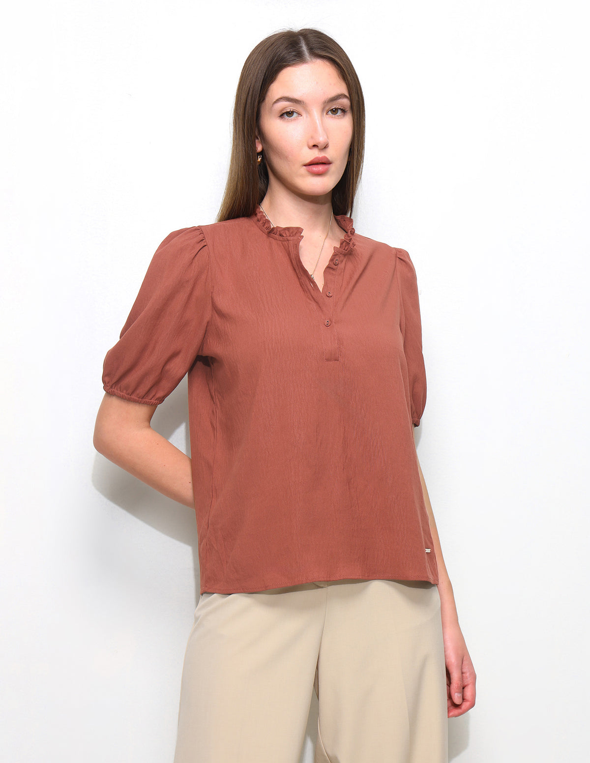 Solid Ruffle Neck Puff Sleeve Top