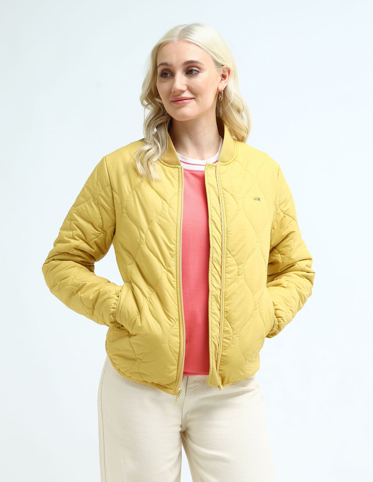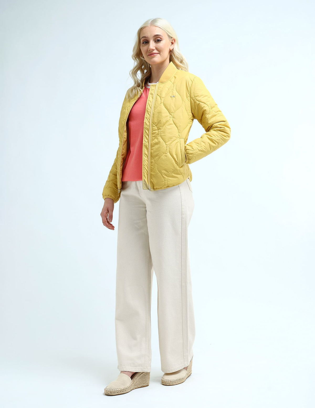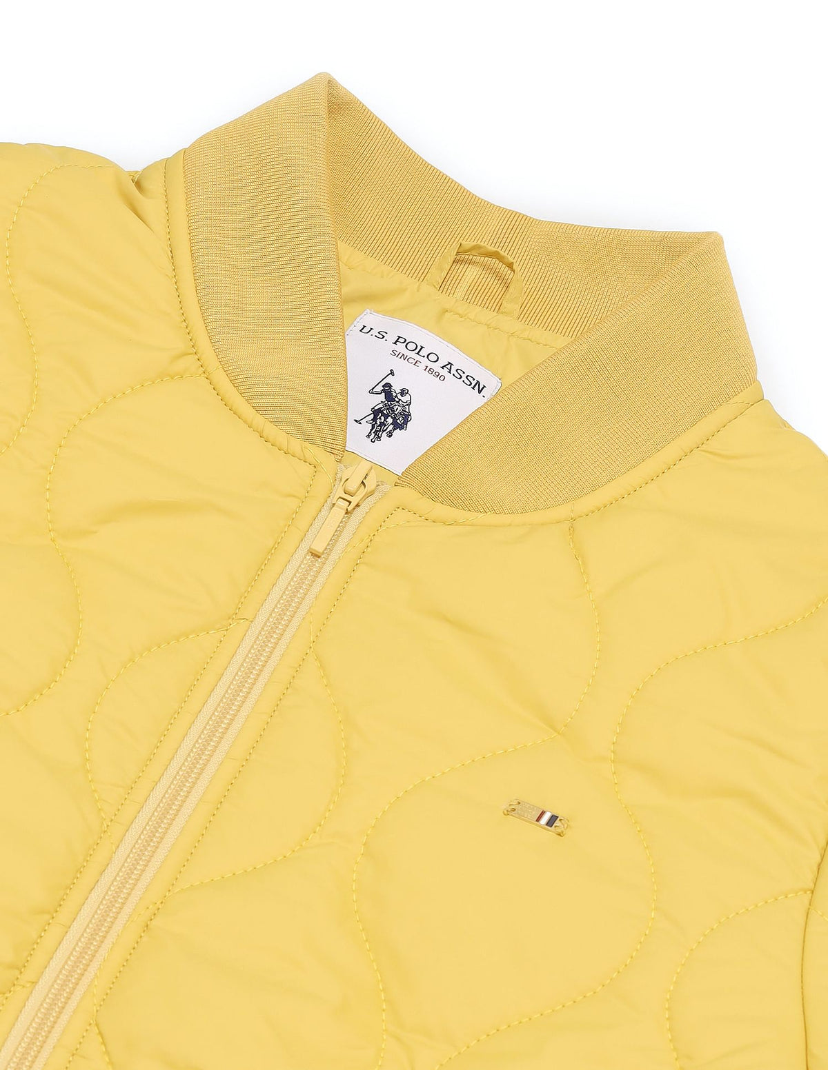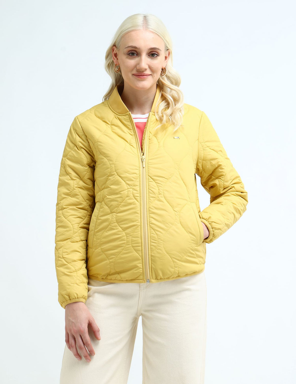 | Stand collar | Logo at chest | Full zipper closure | Long sleeves | Elasticized sleeve hems and hemline | Two pockets | Quilted construction | Solid pattern |
