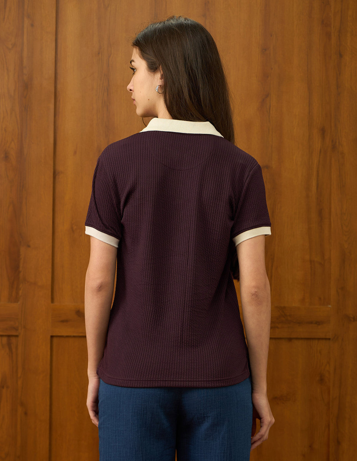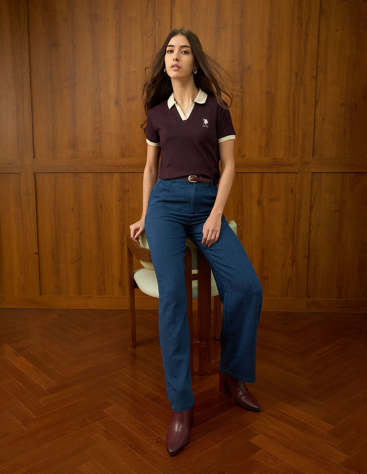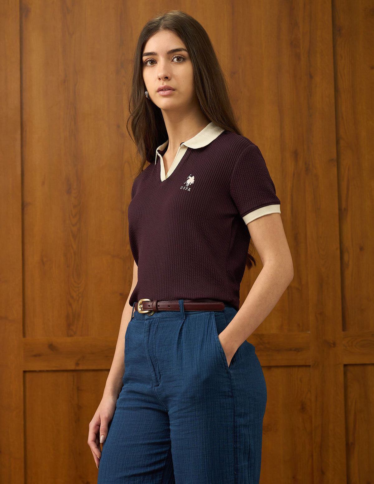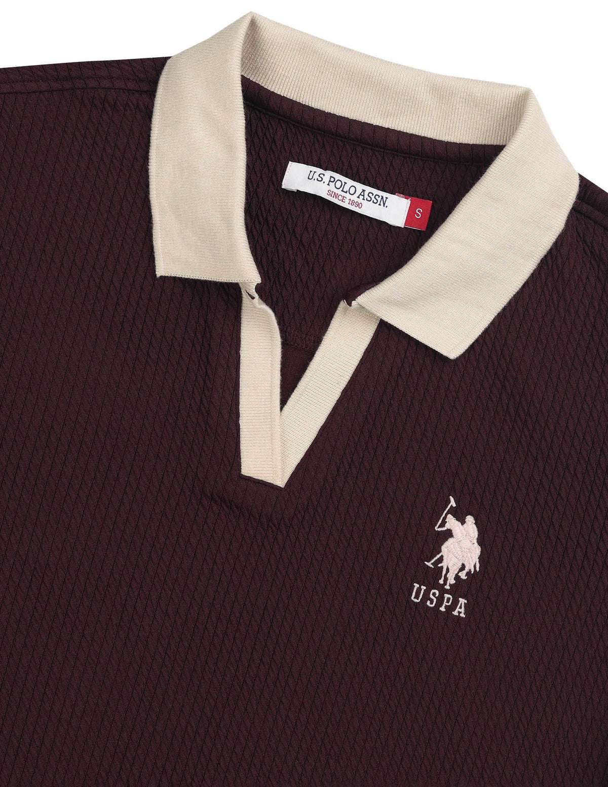 | Polo collar | Logo at chest | Open placket | Short sleeves | Ribbed collar and sleeve hems | Uneven vented hem | Textured pattern | Pique knit | Regular fit |
