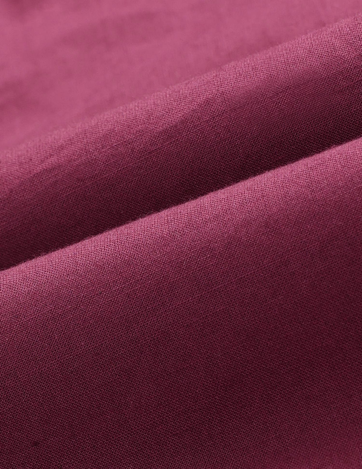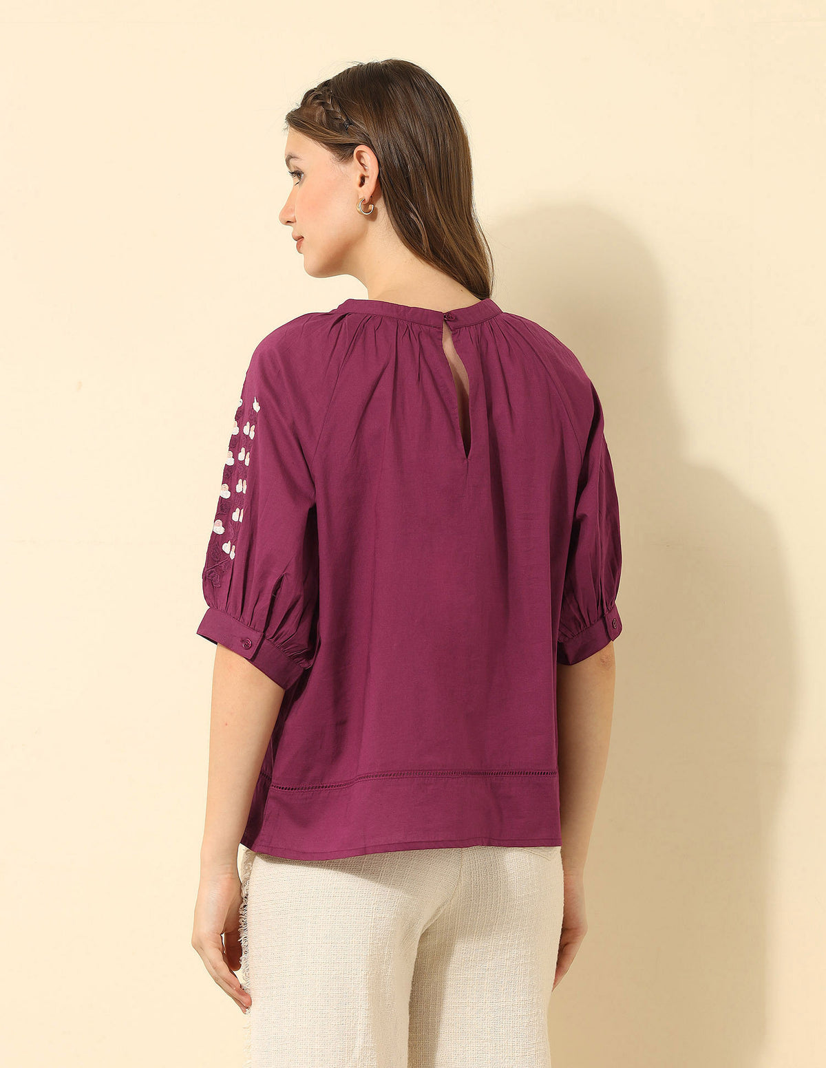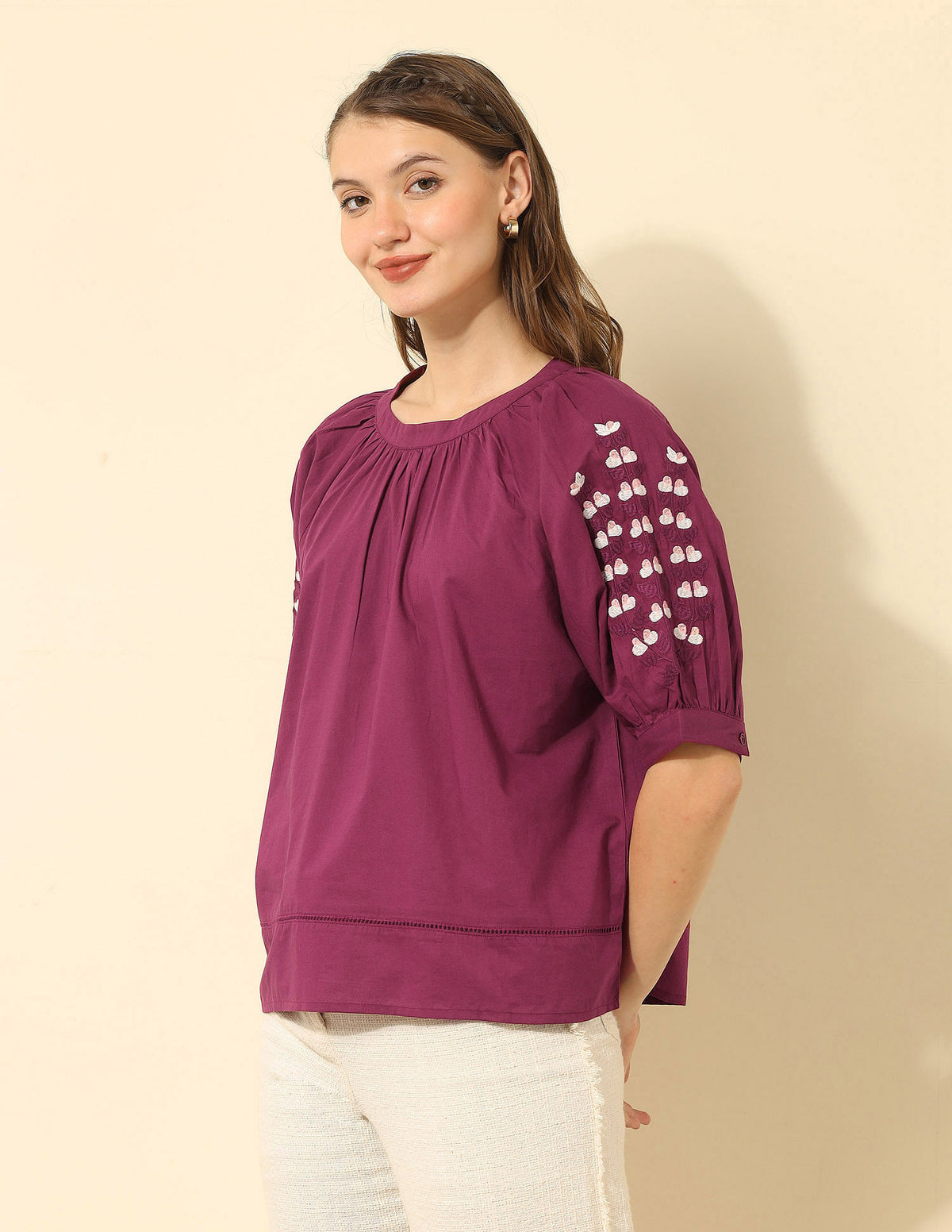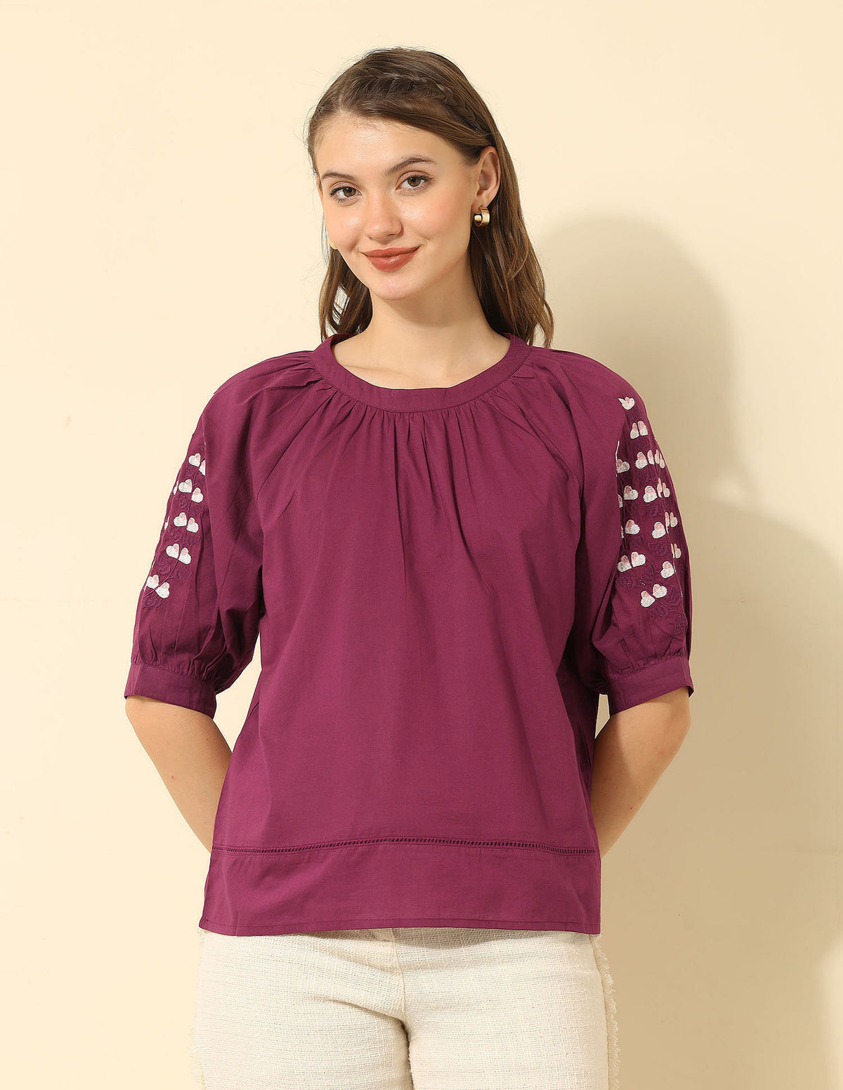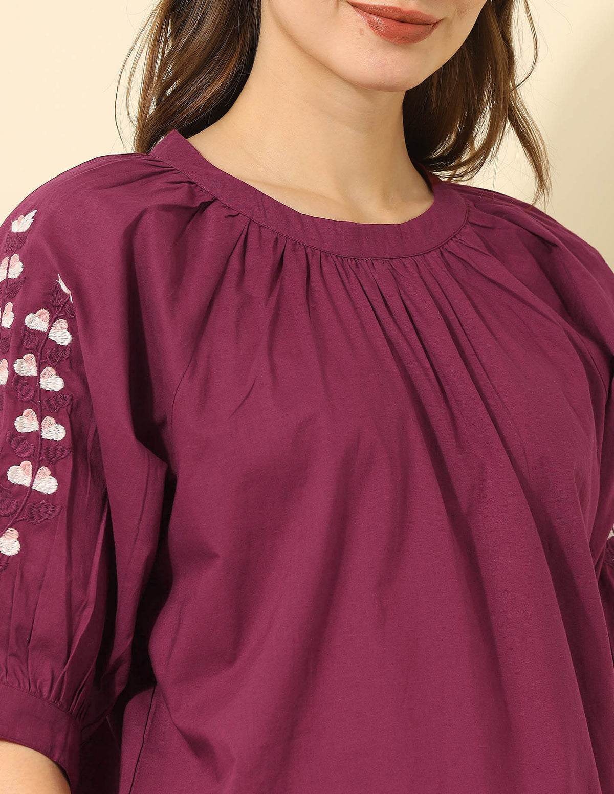 | Round neck | Gathered near yoke | Button and loop closure at back | Short sleeves | Curved hemline | Solid pattern | Regular weave | Regular fit |