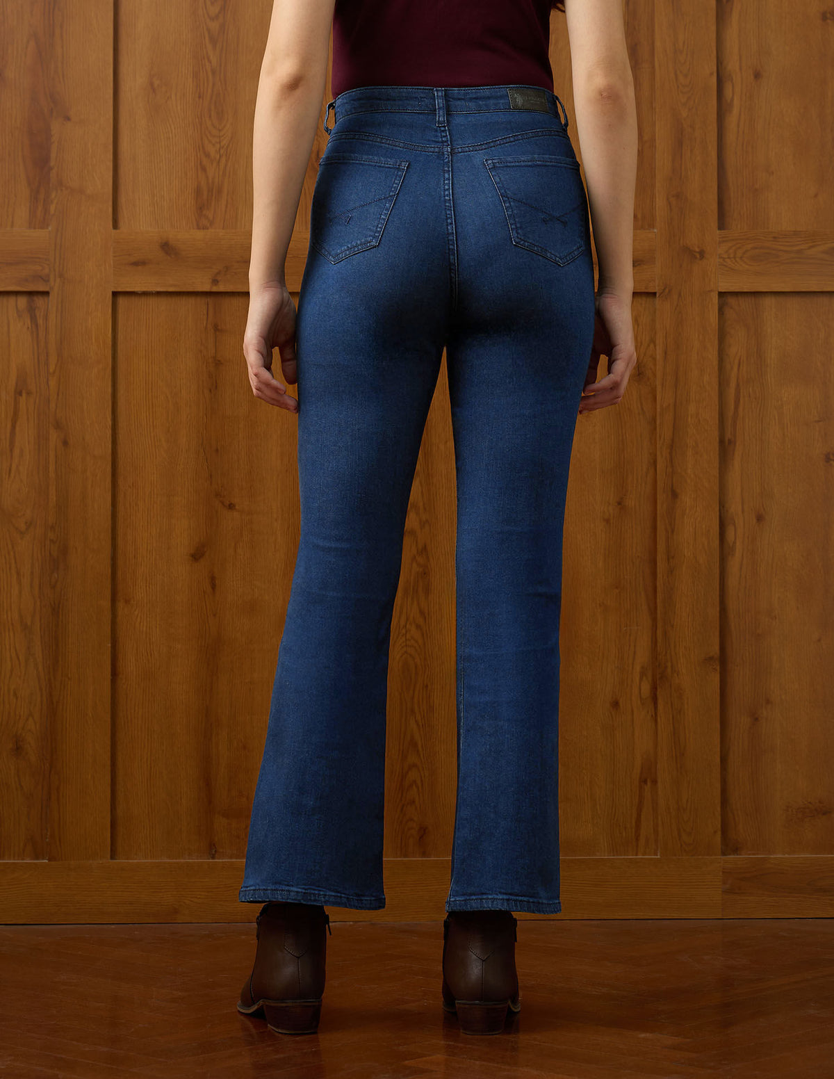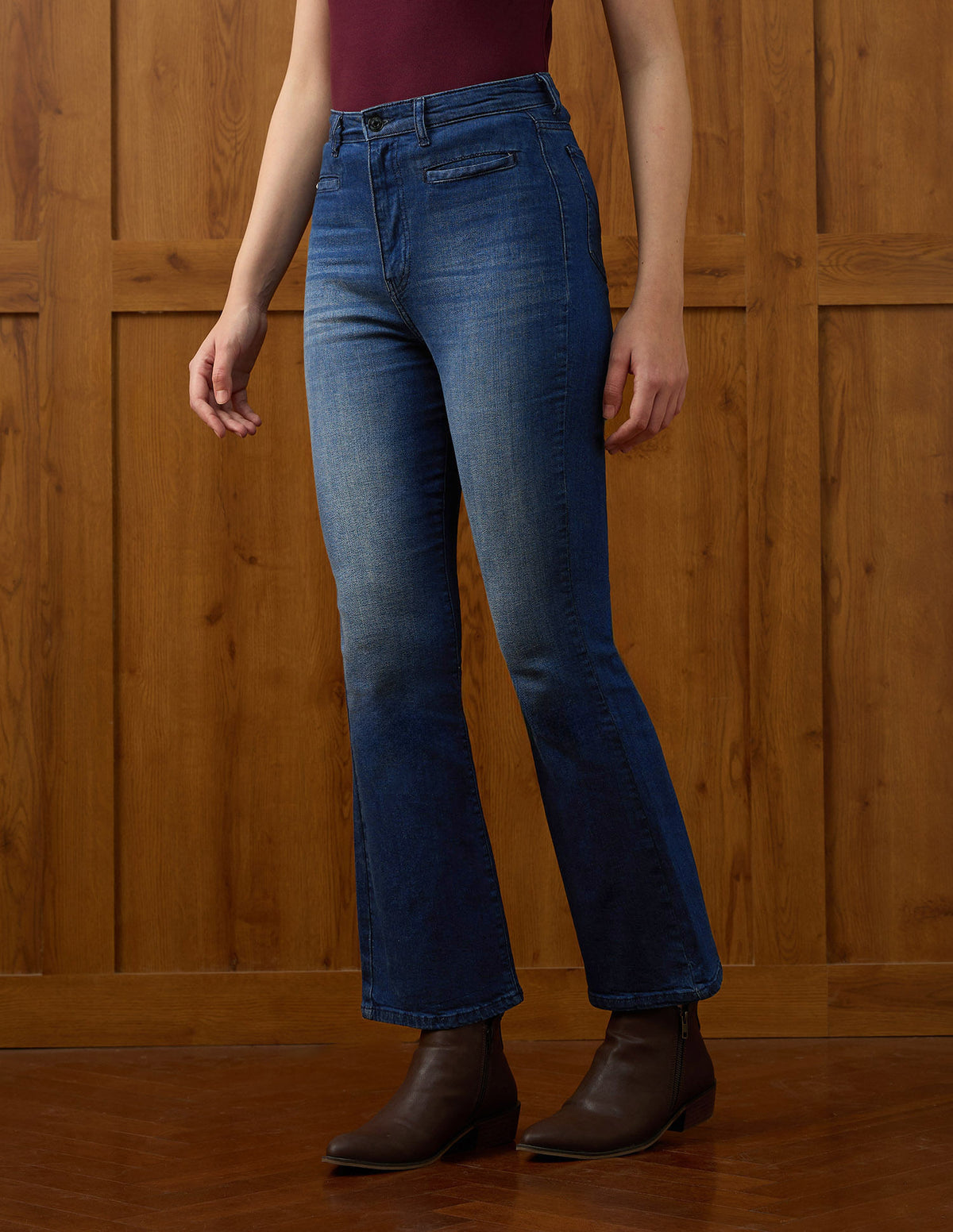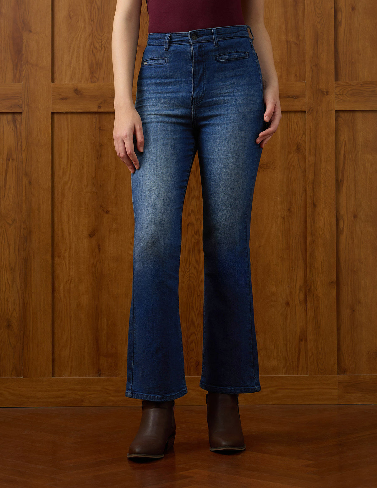 | Ultra high-rise waist | Button and zip fly closure | Five pockets | Whiskered | Denim weave | Bootcut fit |