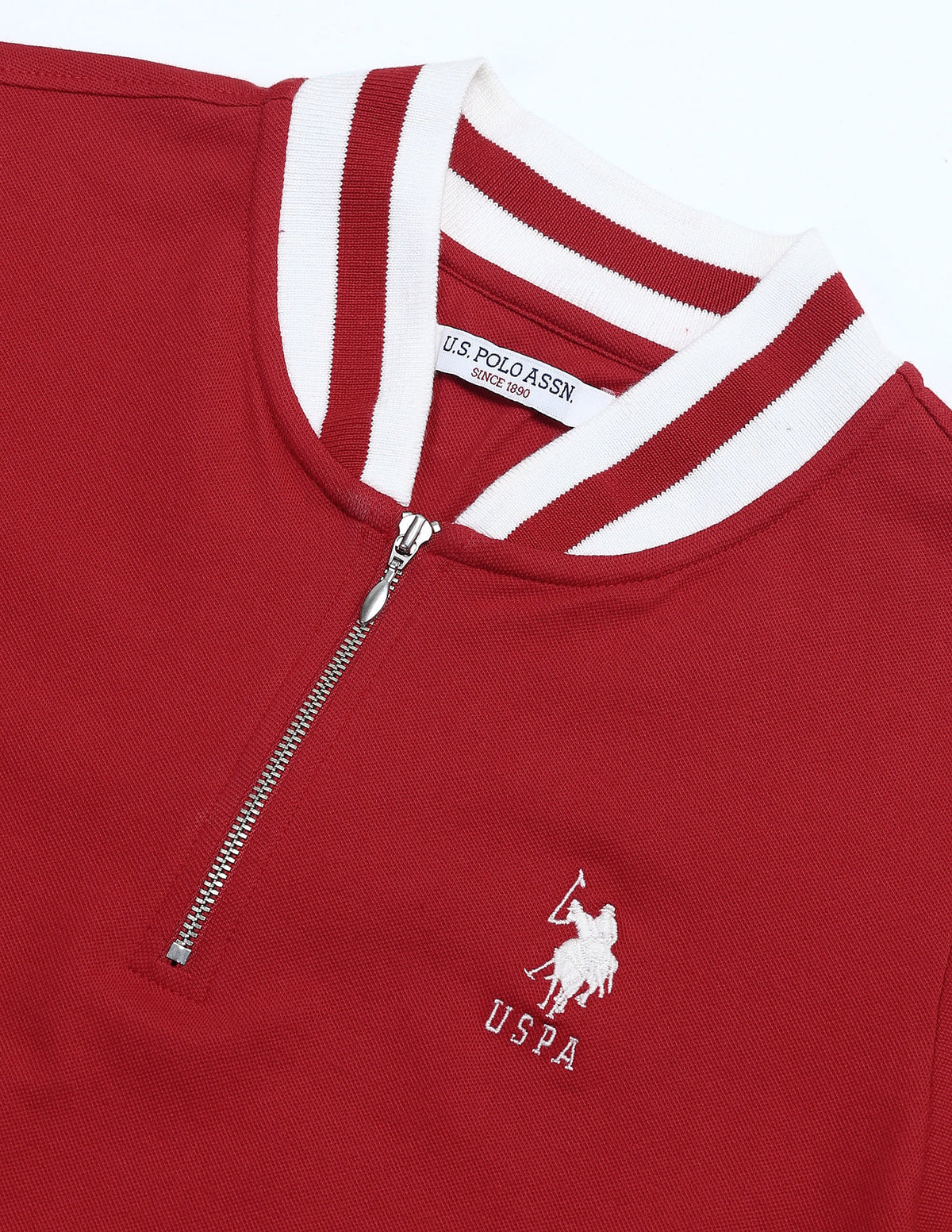 | V-neck | Embroidered logo at chest | Short zipper closure | Short sleeves | Ribbed and striped collar, sleeve hems and hemline | Straight hem | Solid pattern | Pique knit | Regular fit