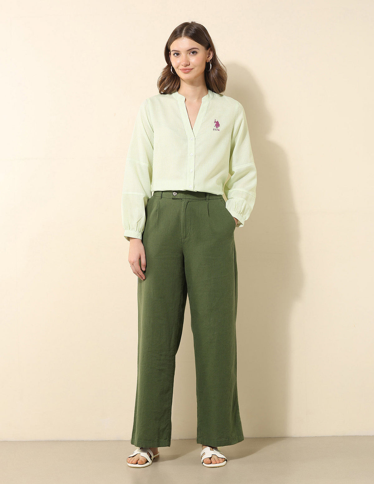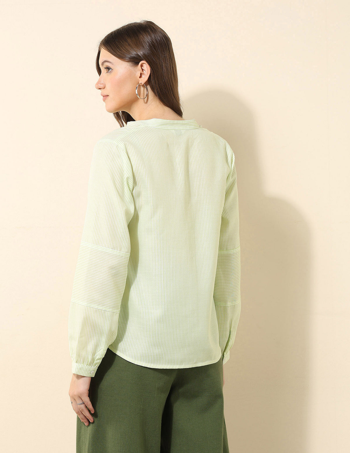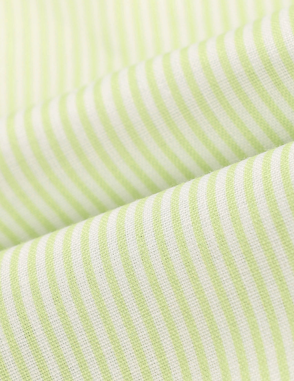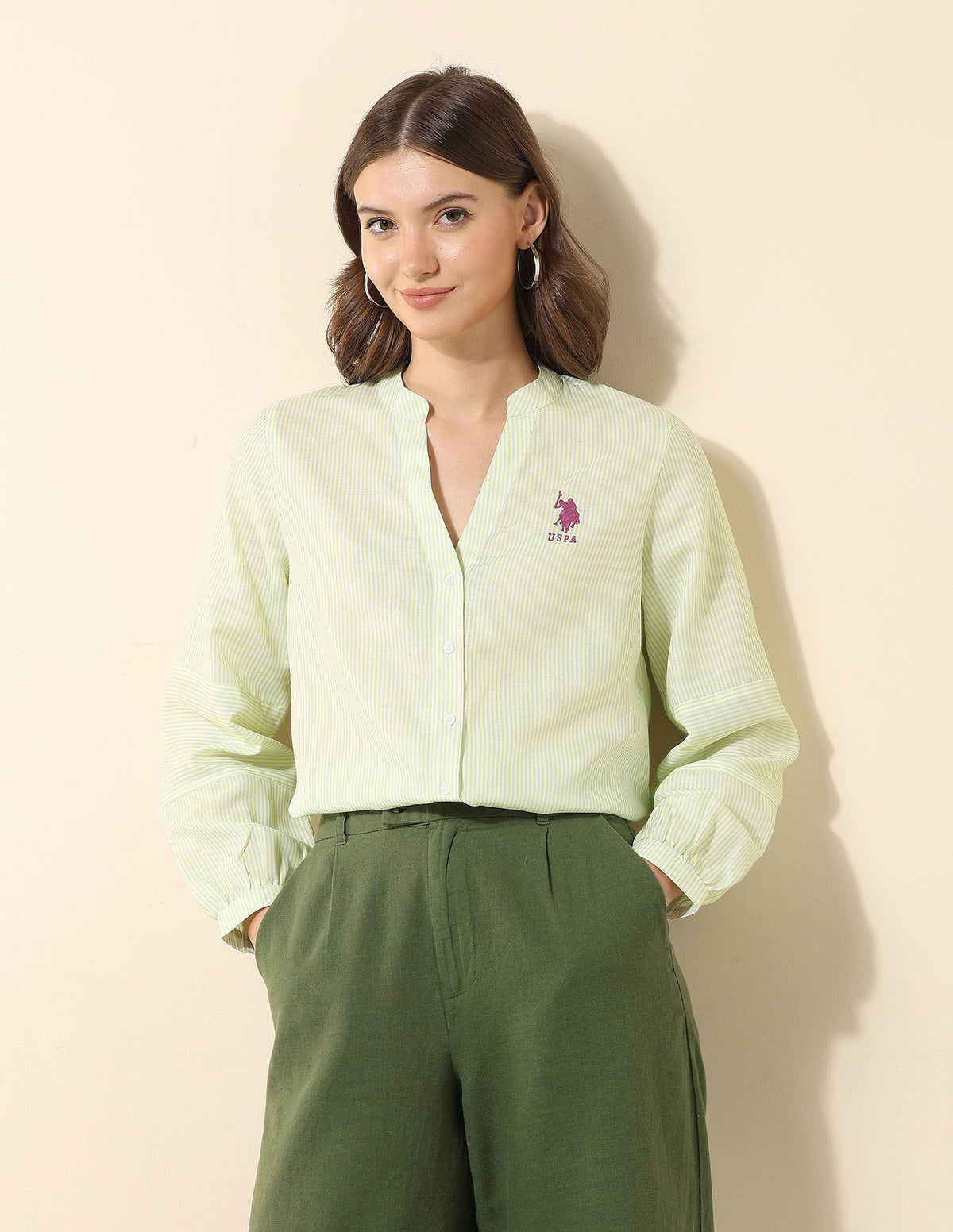 | Mandarin collar | Logo at chest | Full button placket | Long sleeves with barrel cuffs | Curved hemline | Vertical striped pattern | Regular weave | Regular fit |