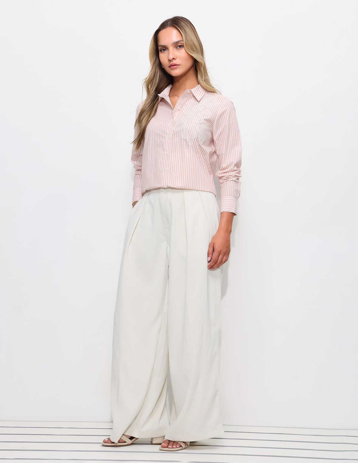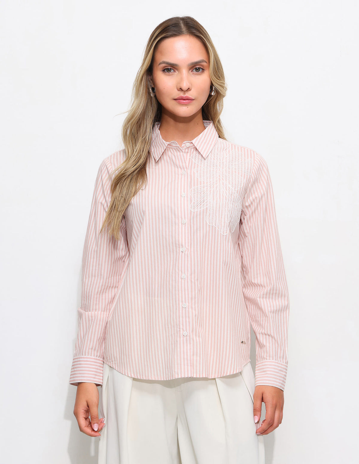 | Spread collar | Logo at chest | Full button placket | Long sleeves with barrel cuffs | Curved hemline | Vertical striped pattern | Regular weave | Regular fit