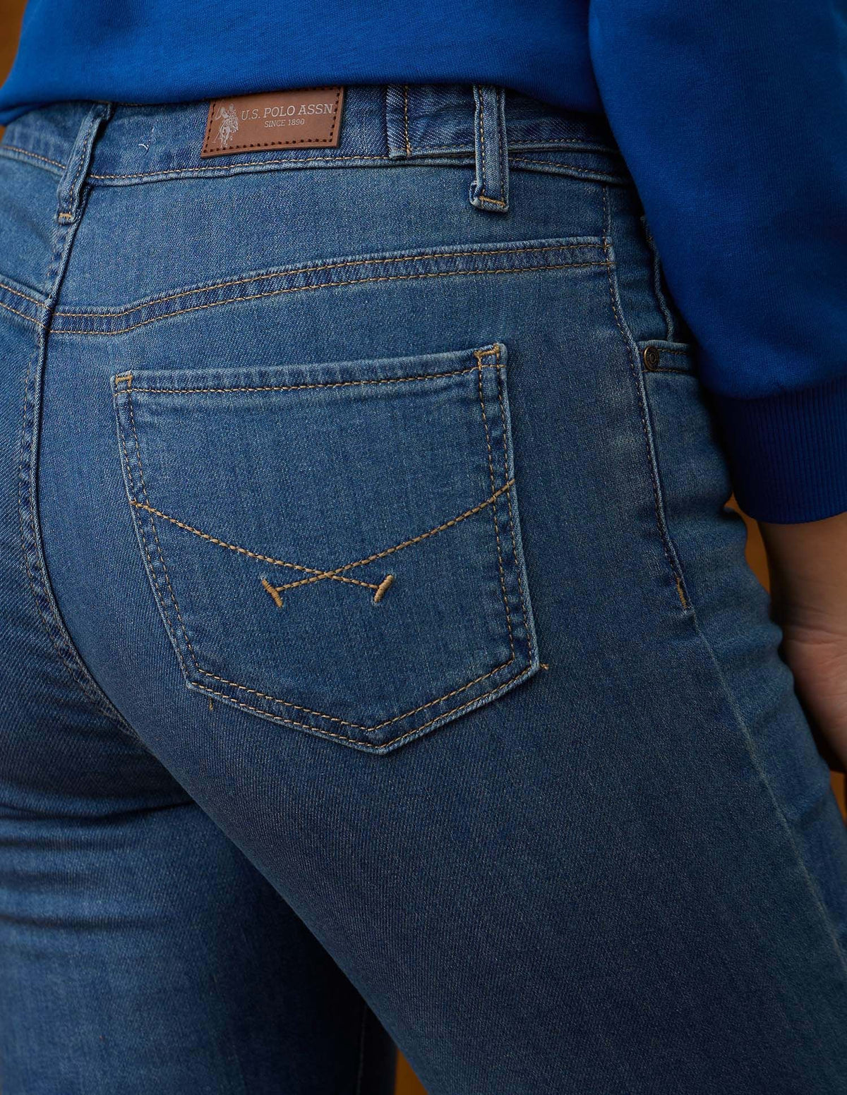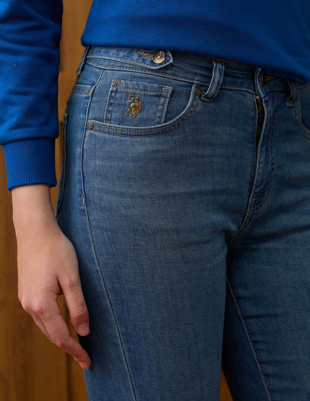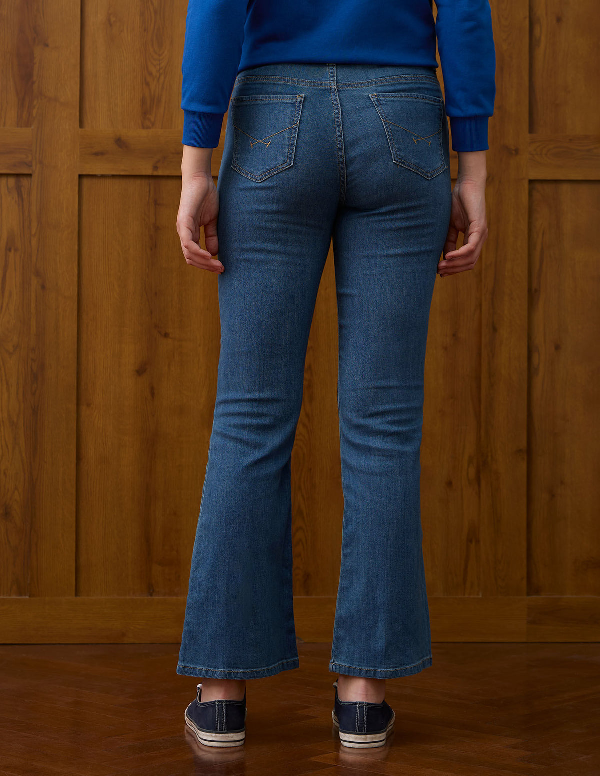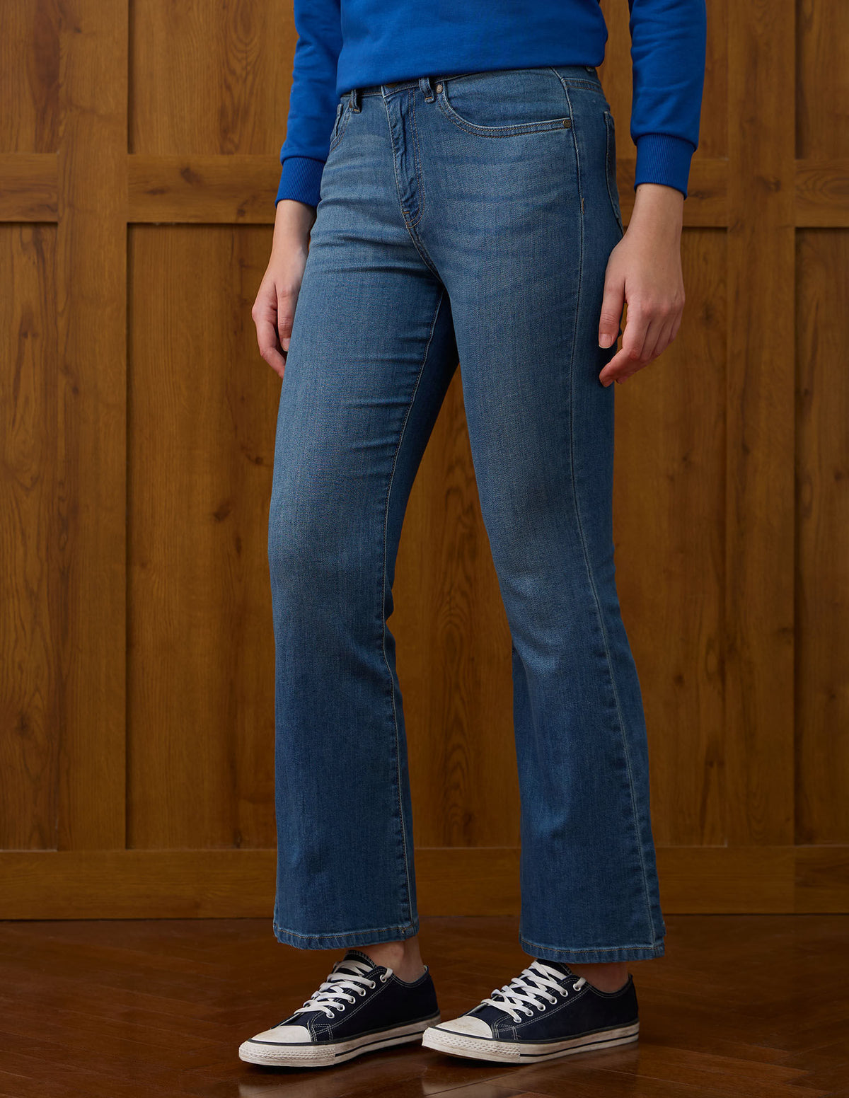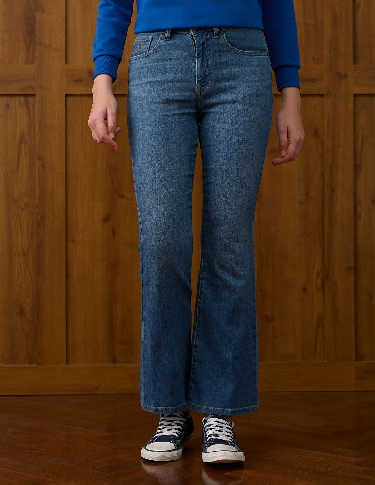 | Mid-rise waist | Button and zip fly closure | Five pockets | Whiskered | Denim weave | Flared fit |
