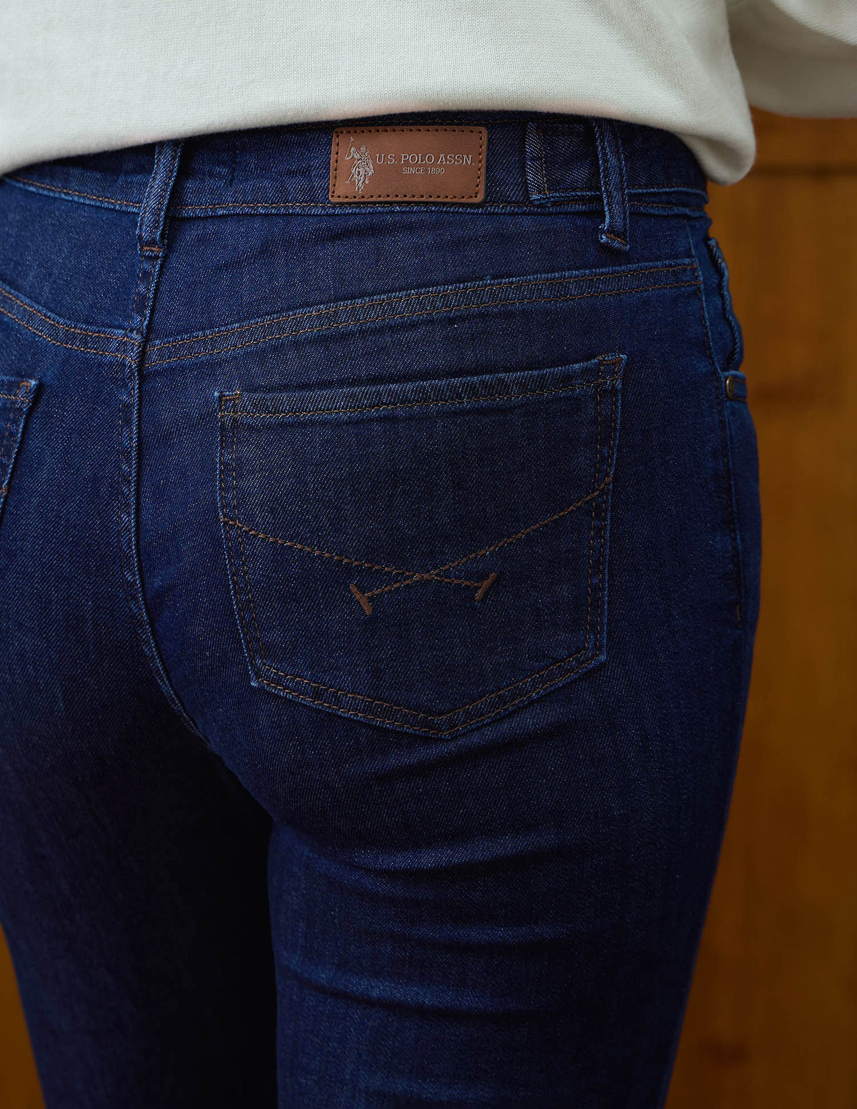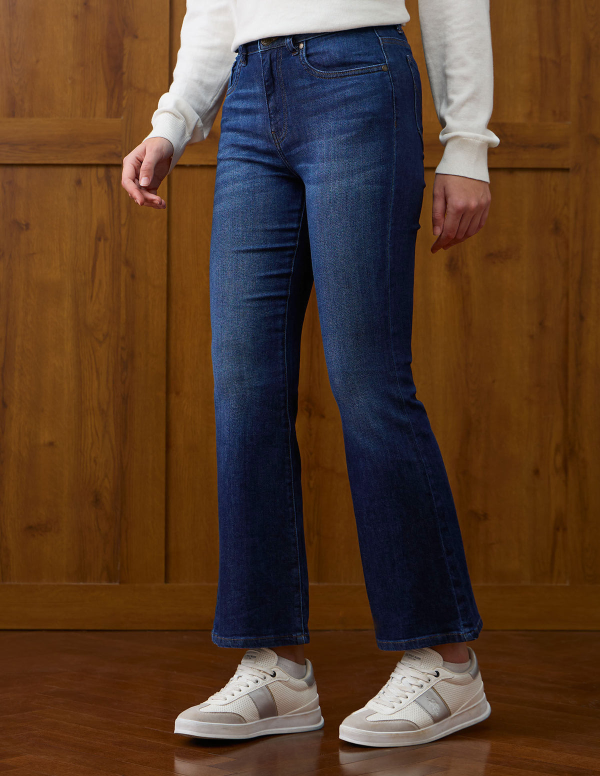 | Mid-rise waist | Button and zip fly closure | Five pockets | Whiskered | Denim weave | Flared fit |