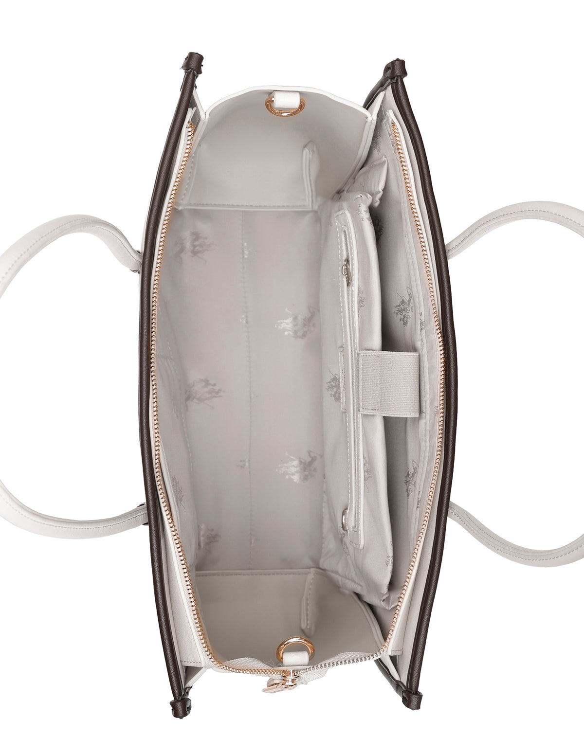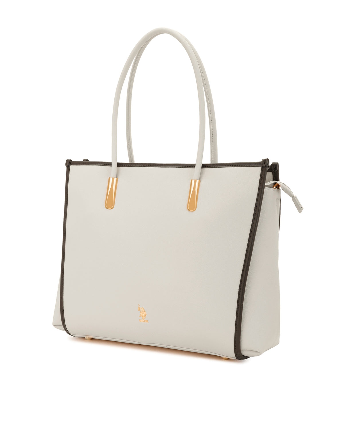 - Metallic monogram accent at front
