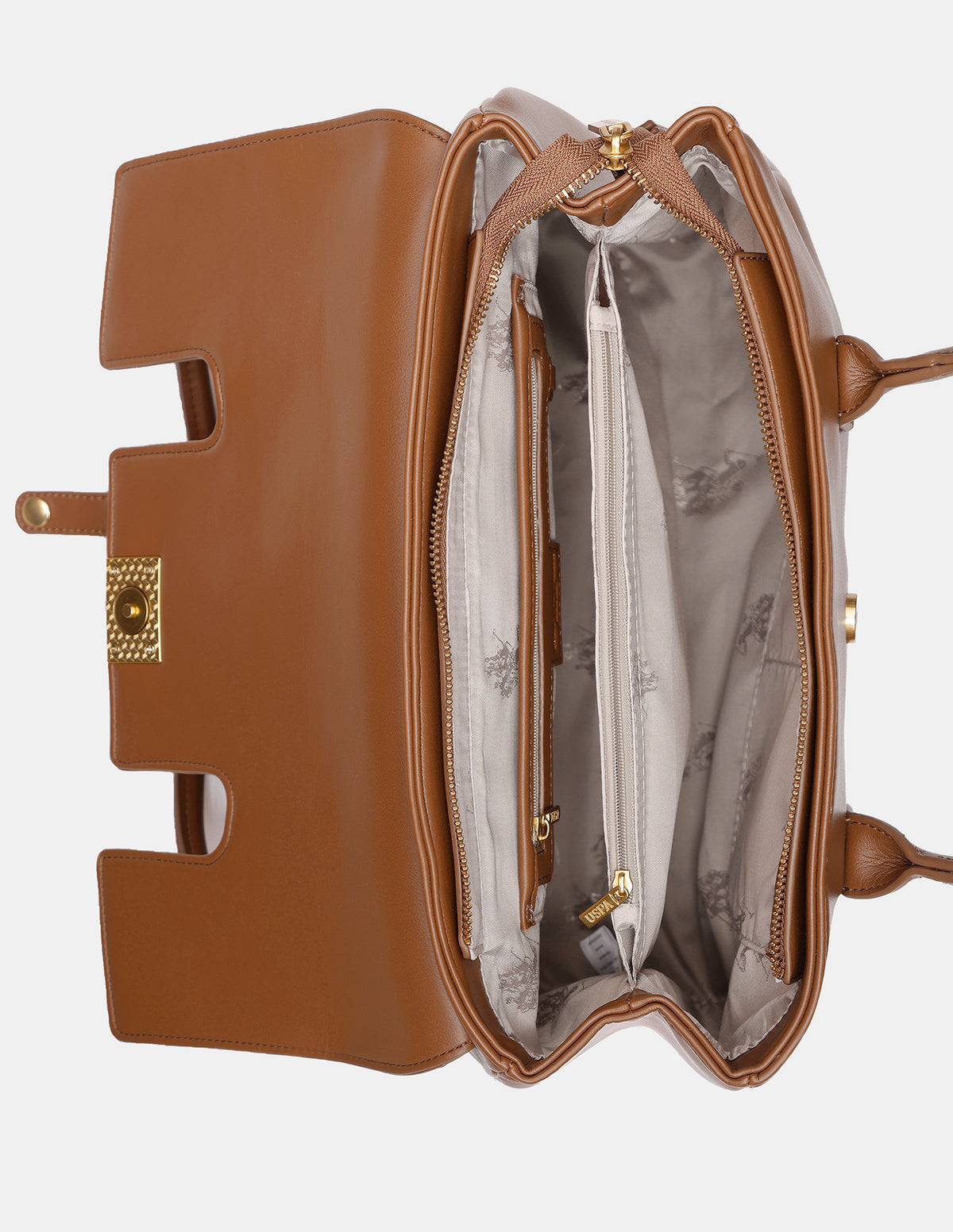- Metallic monogram accent at front