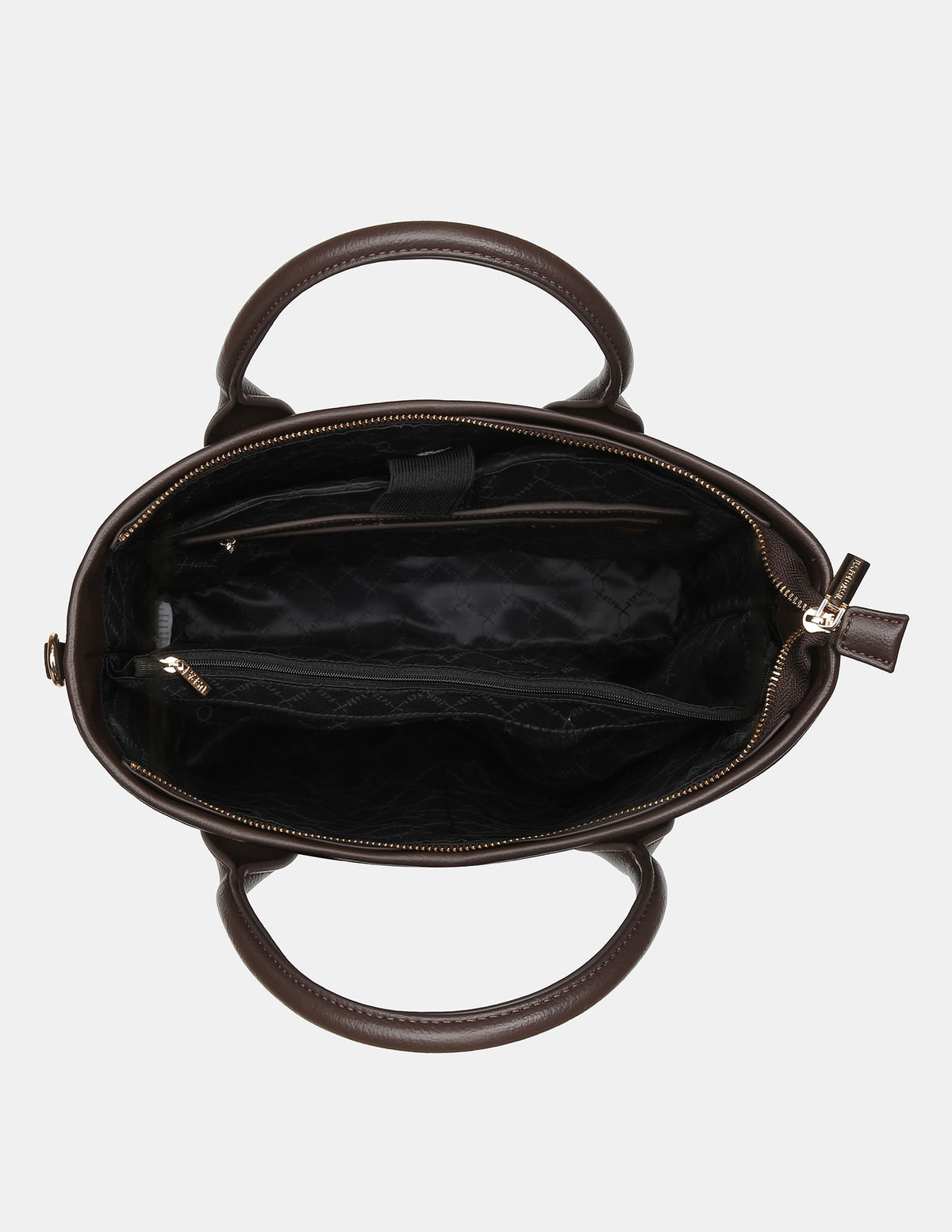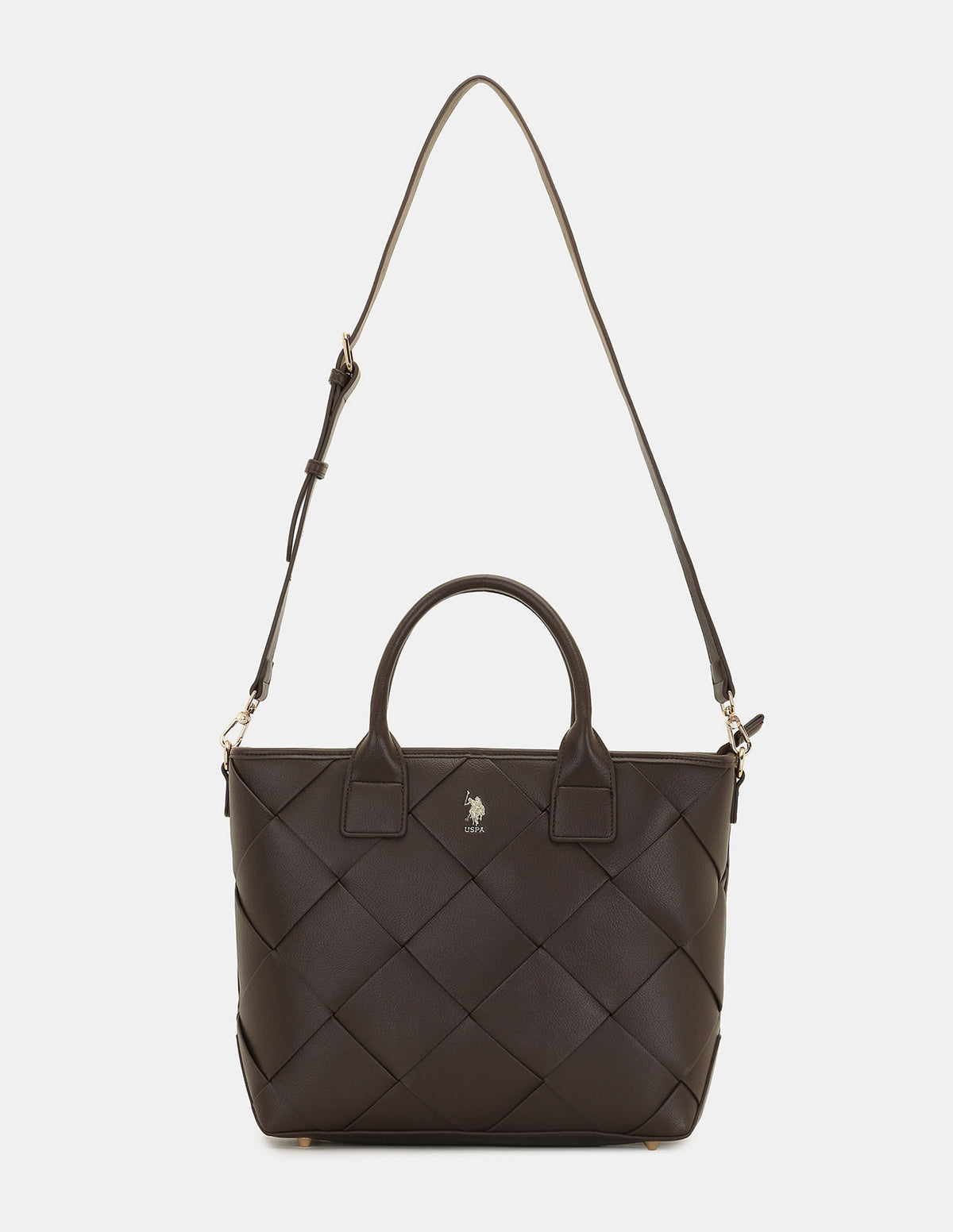 - Adjustable and detachable shoulder strap Metallic monogram accent at front