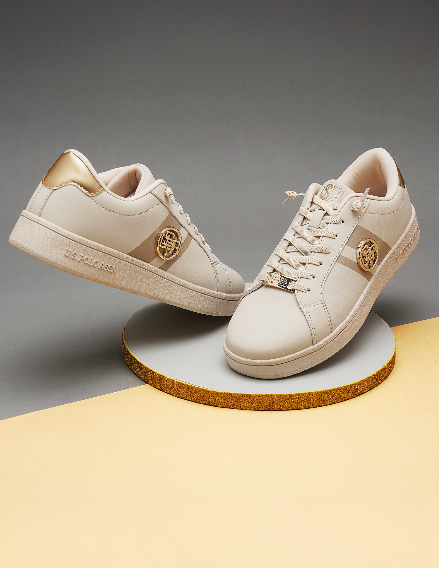 | Round toe | Central lacing | Panelled upper with logo | Padded top line | Cushioned insole | Textured outsole | Glitter appliqued pattern |