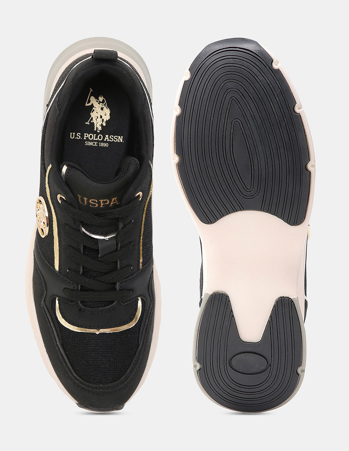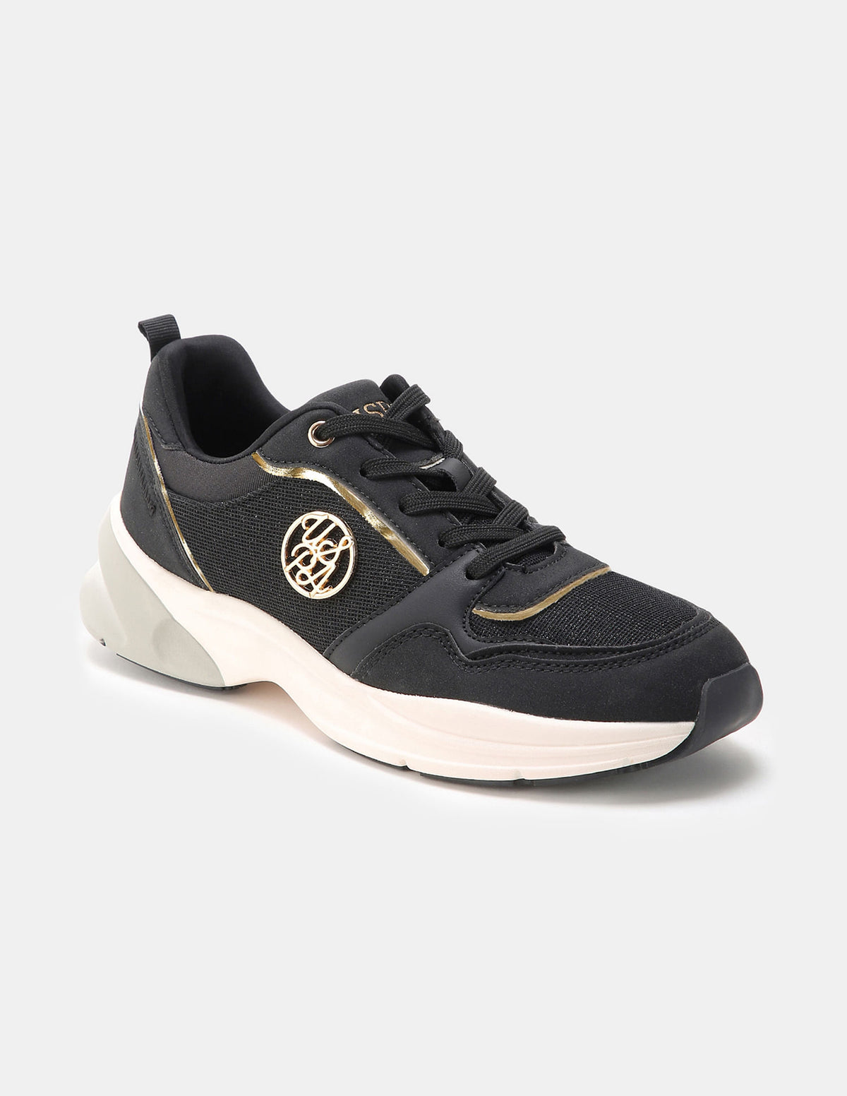- Panelled upper with brand print and circular metallic logo