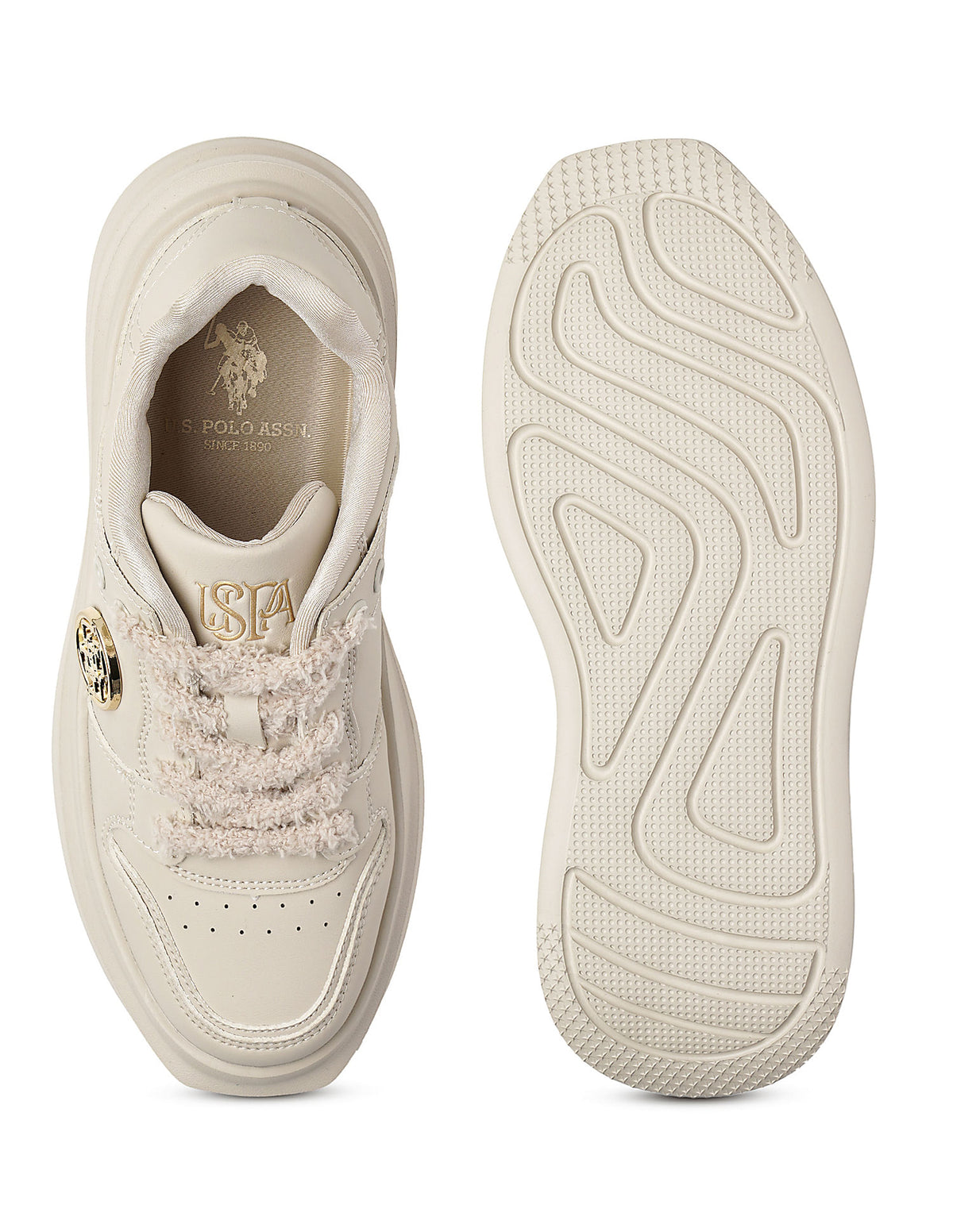 - Panelled upper with brand print and circular metallic logo