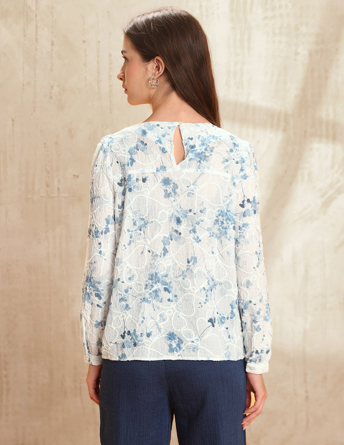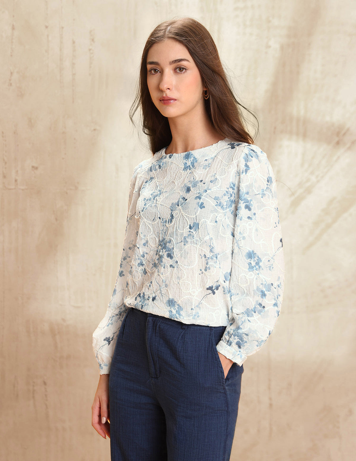 | Round neck | Button and loop closure at back | Long sleeves with elasticized hems | Straight hemline | Floral self design pattern | Regular weave | Regular fit |