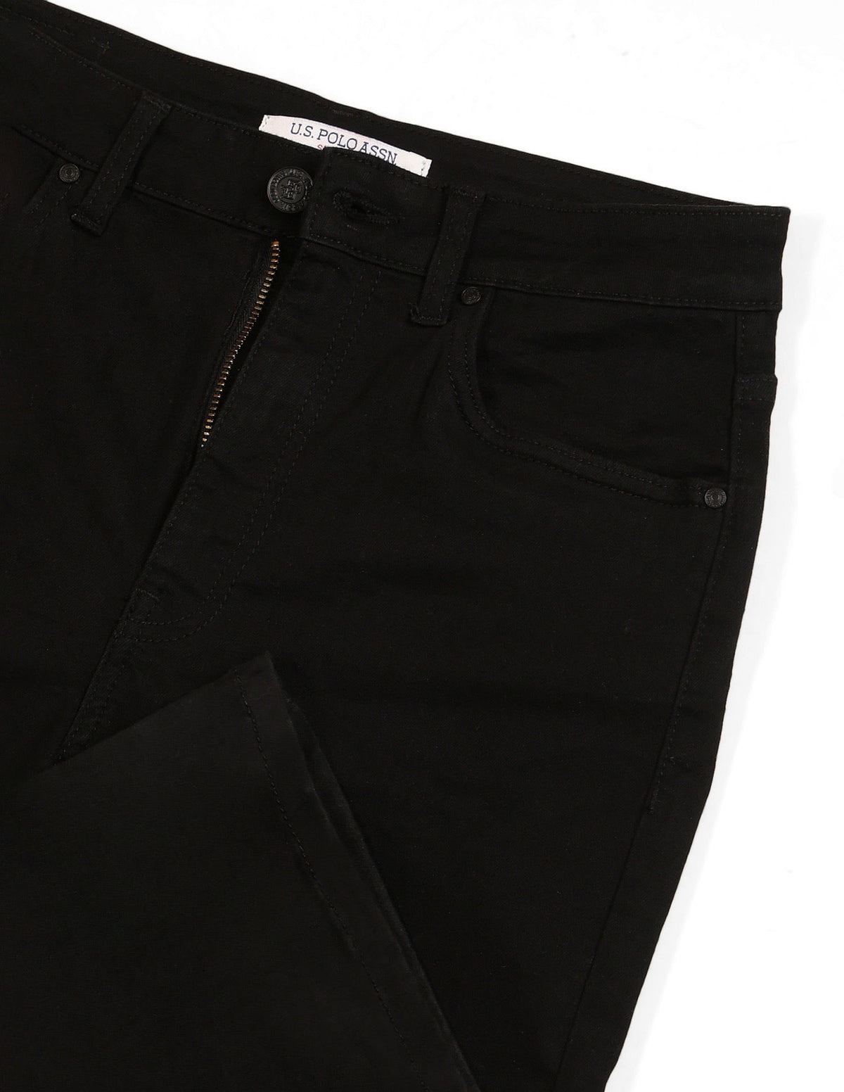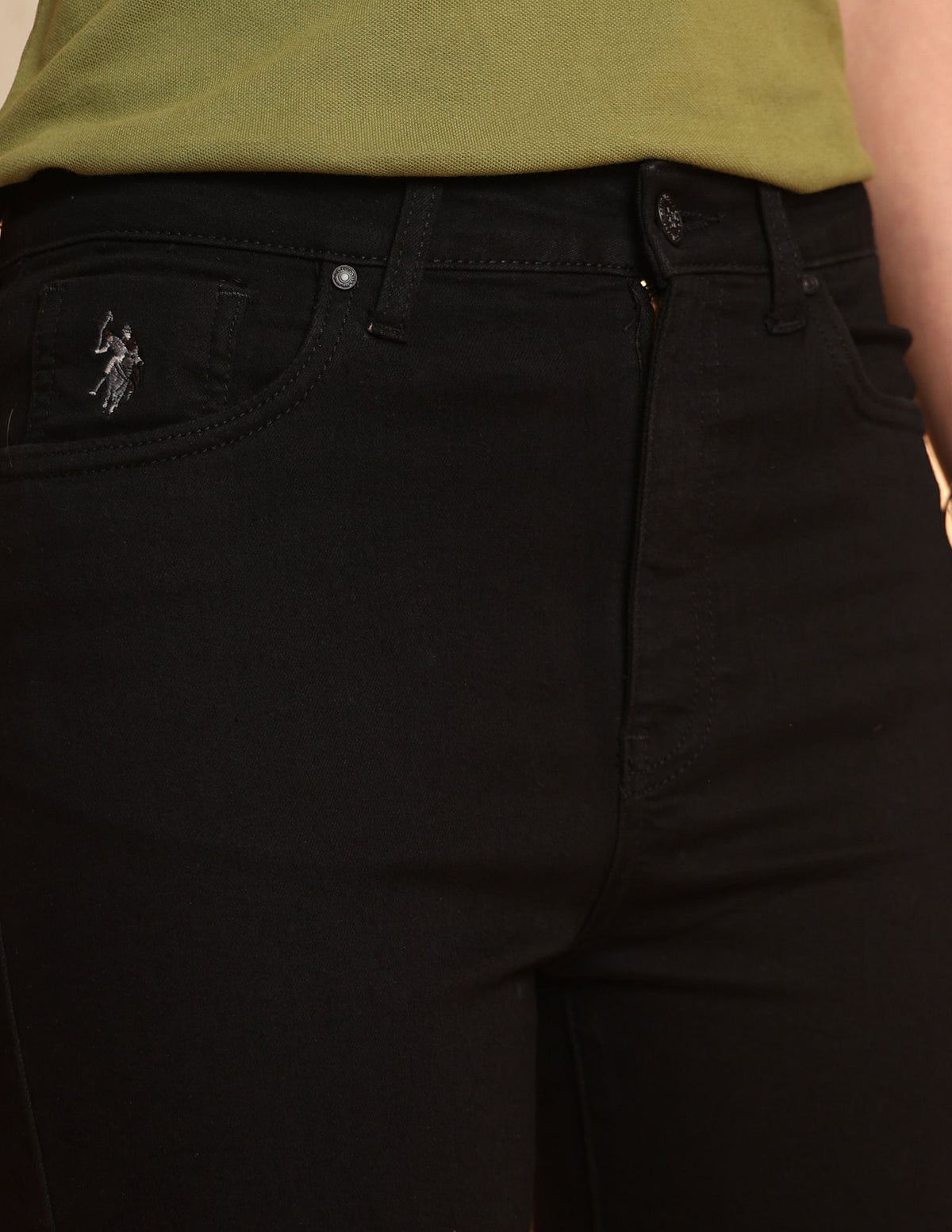 | High-rise waist | Button and zip fly closure | Five pockets | Dark washed | Denim weave | Bootcut |