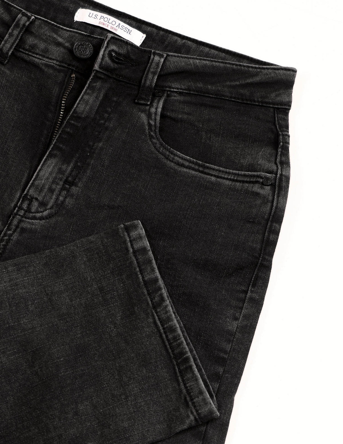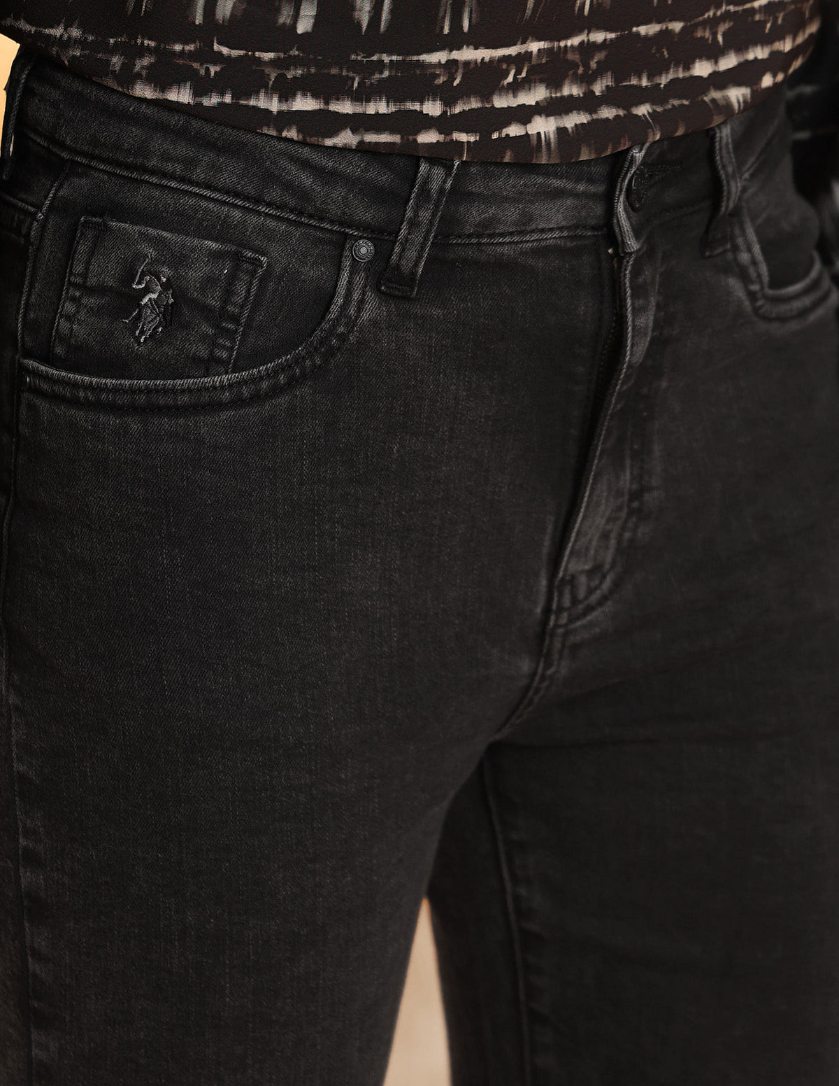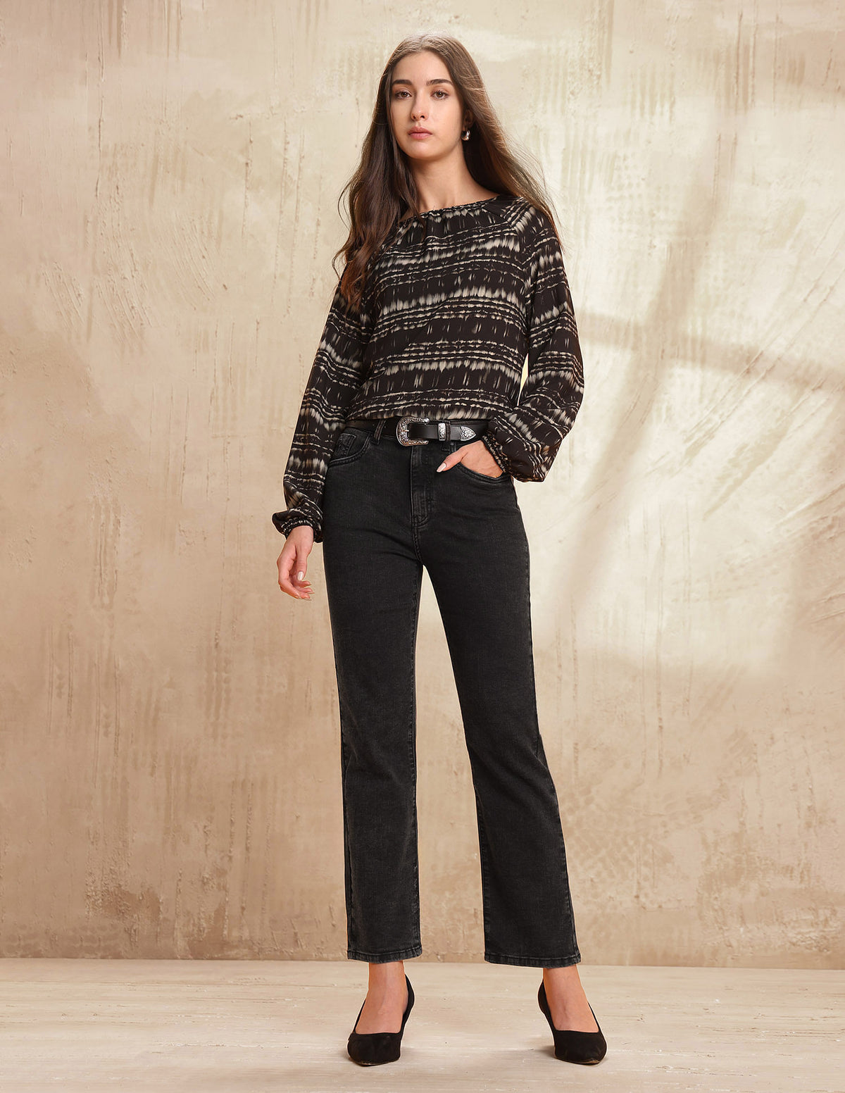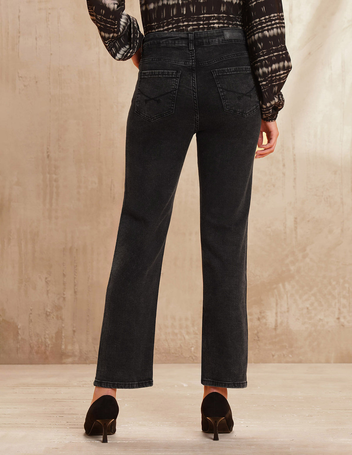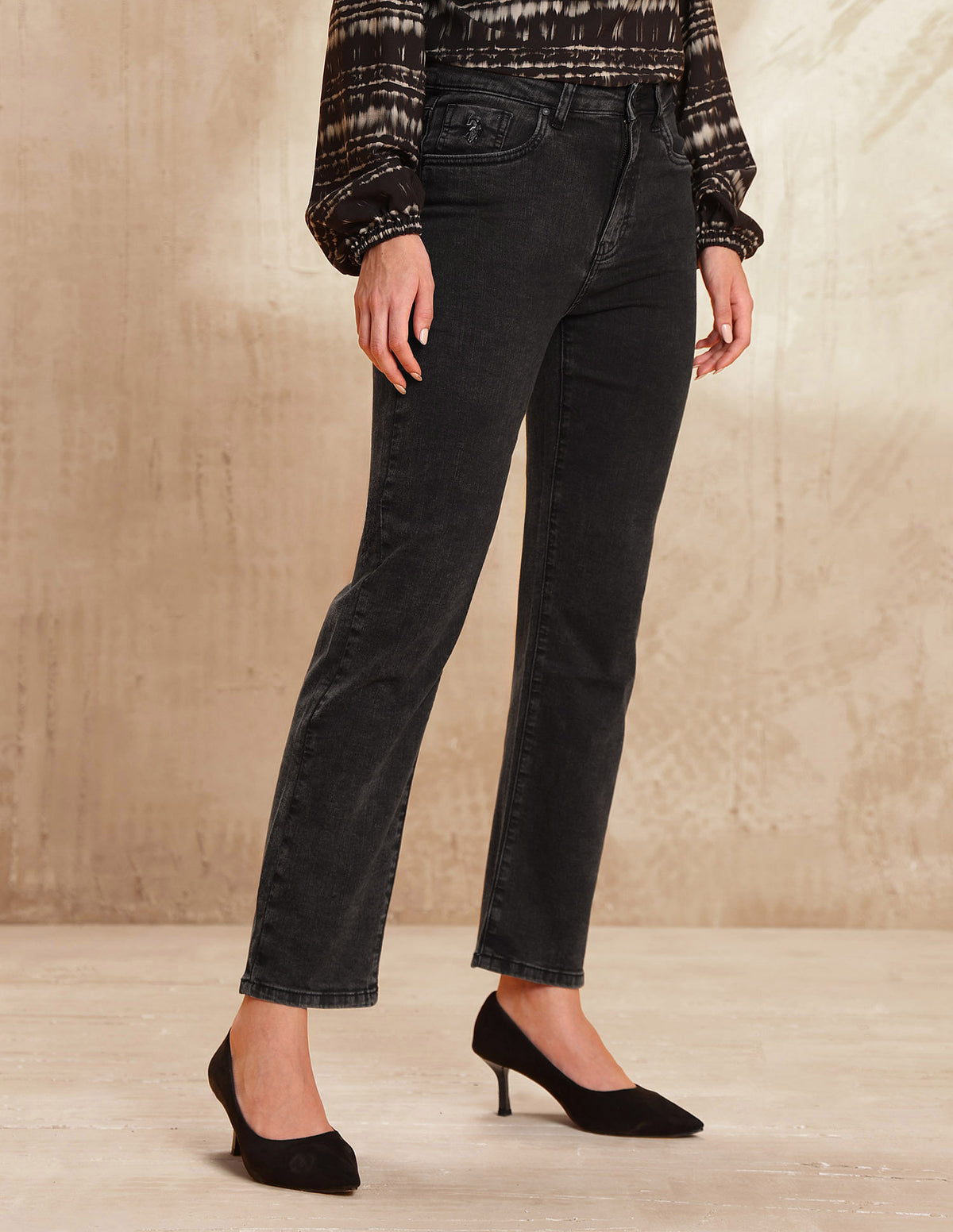 | High-rise waist | Button and zip fly closure | Five pockets | Dark washed | Denim weave | Straight fit |