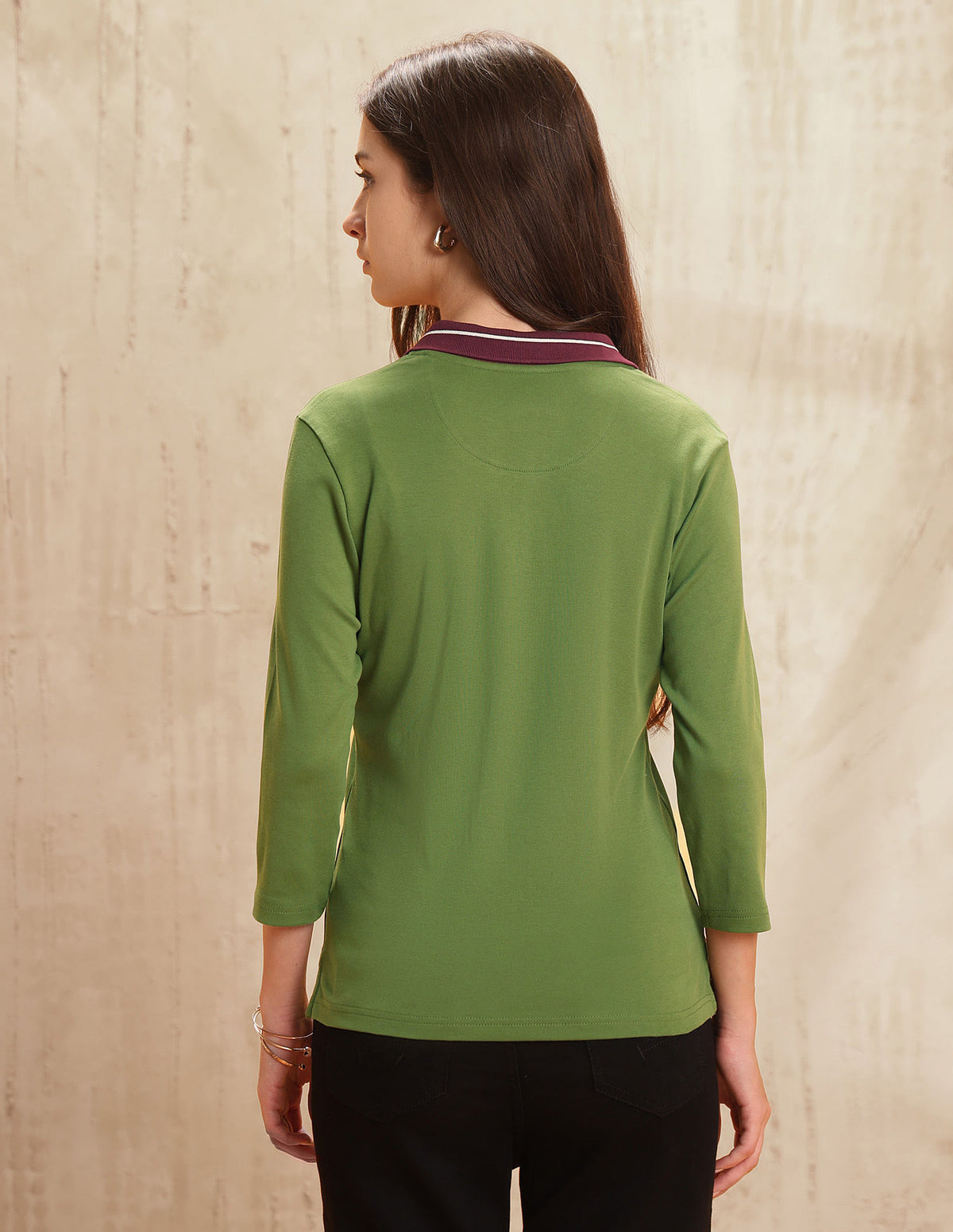 | Polo collar | Open placket | Logo at chest | Three-quarter sleeves | Ribbed collar and sleeve hems | Uneven vented hem | Solid pattern | Pique knit | Regular fit |