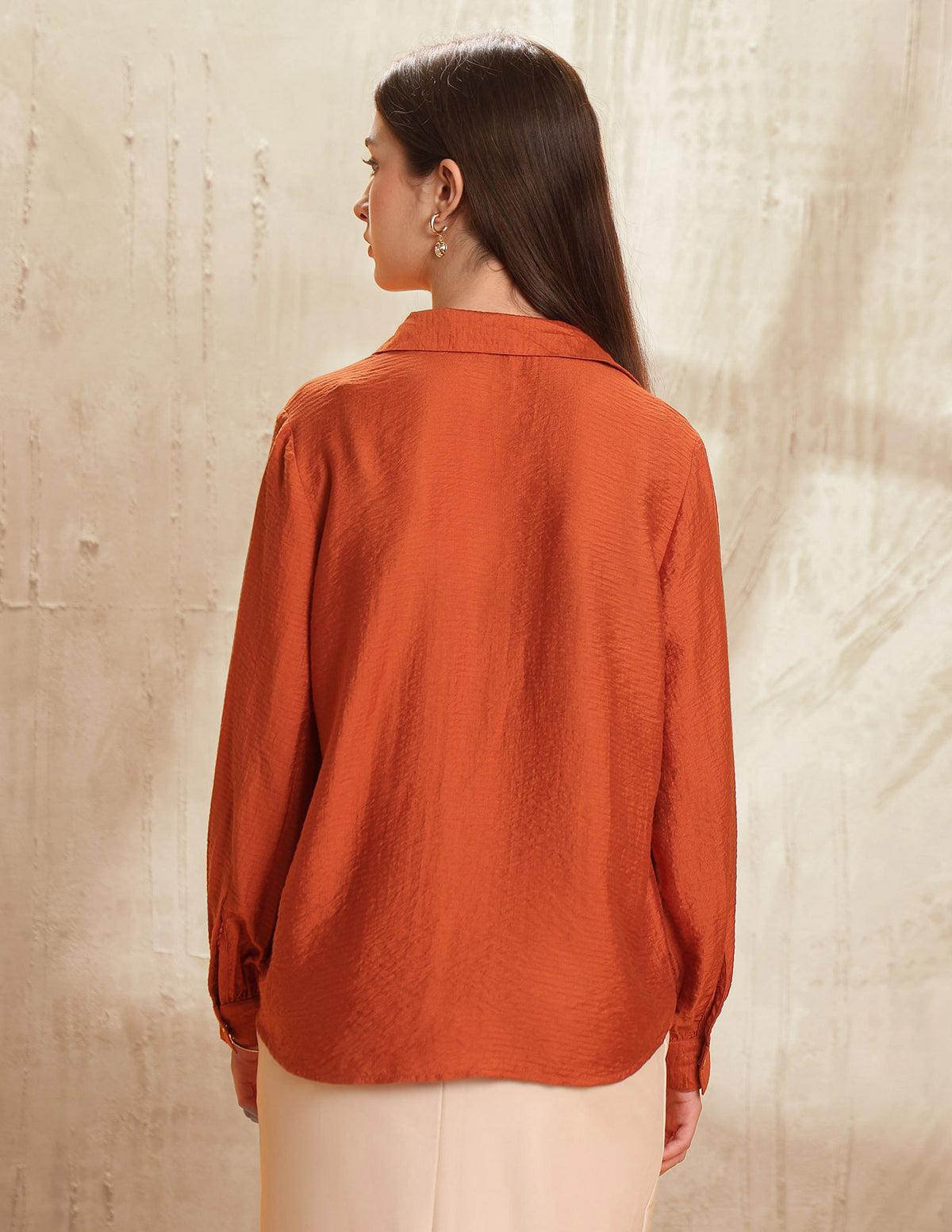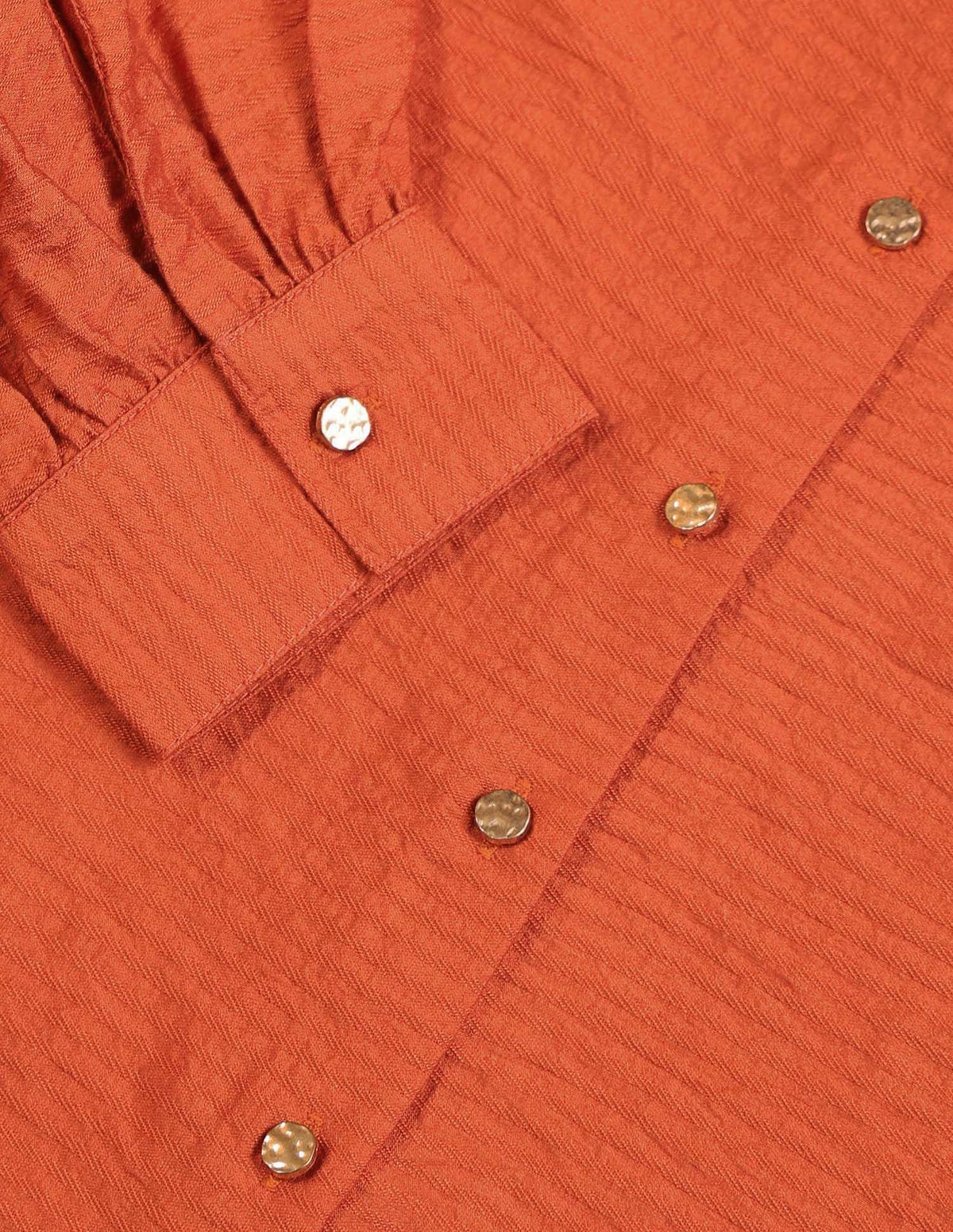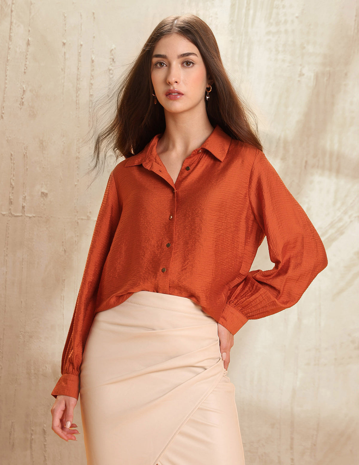 | Spread collar | Full button placket | Long sleeves with barrel cuffs | Curved hemline | Textured self design pattern | Regular weave | Relaxed fit |
