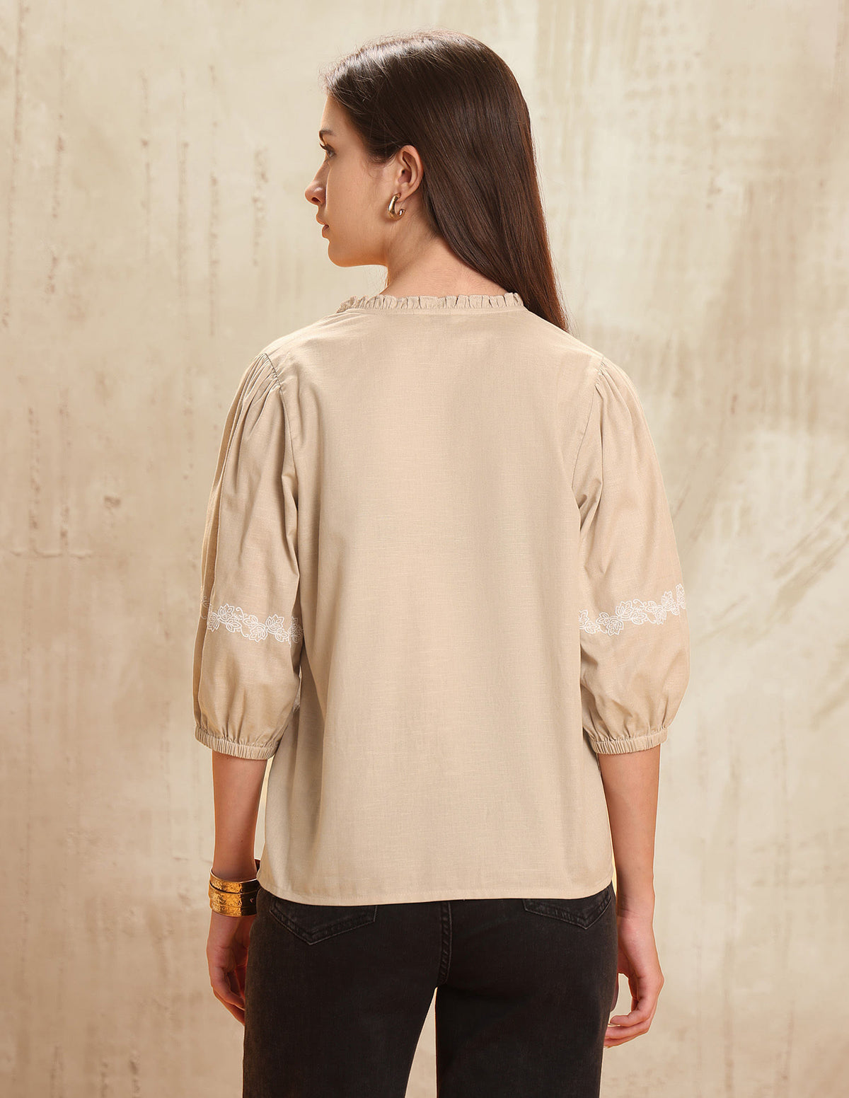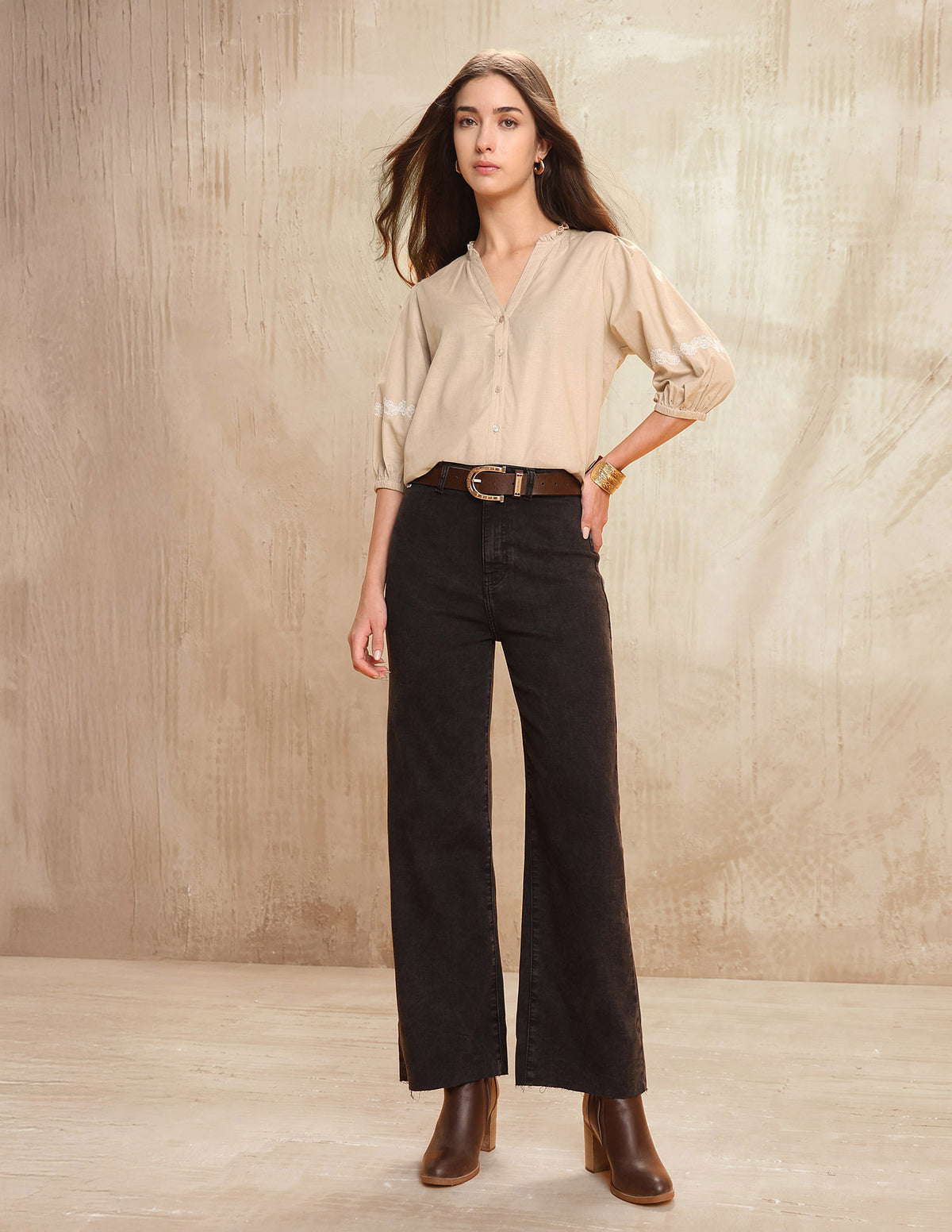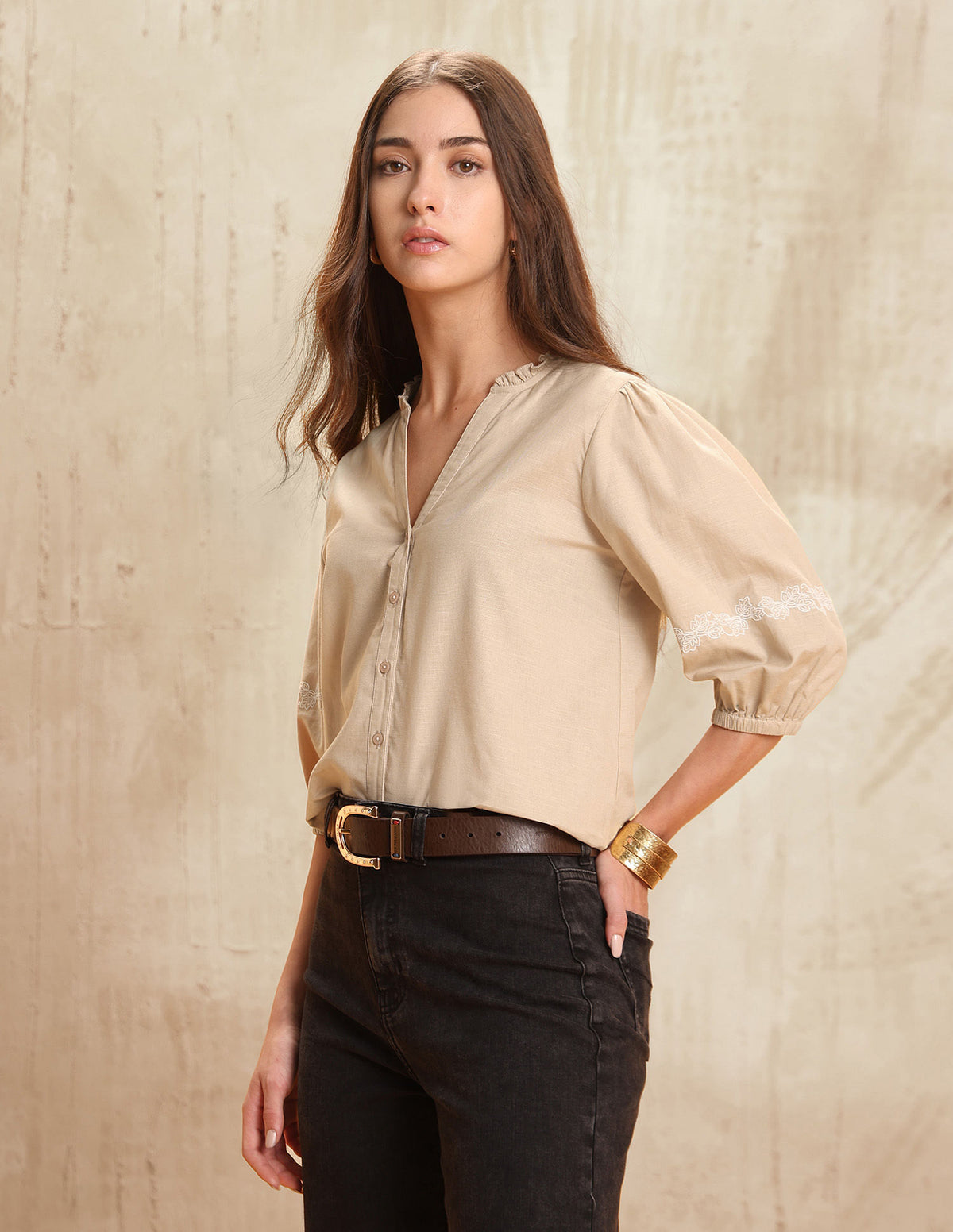 | Mandarin collar | Full button closure | Three-quarter sleeves with elasticized hems | Straight hemline | Solid pattern | Regular weave | Regular fit |