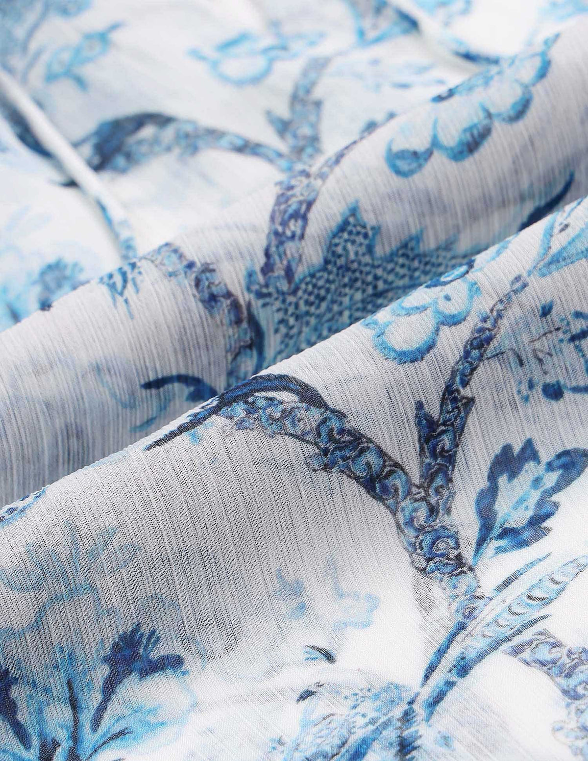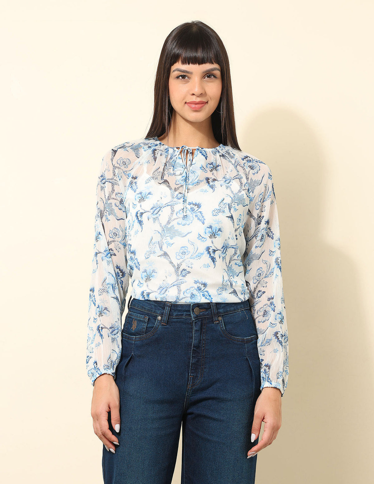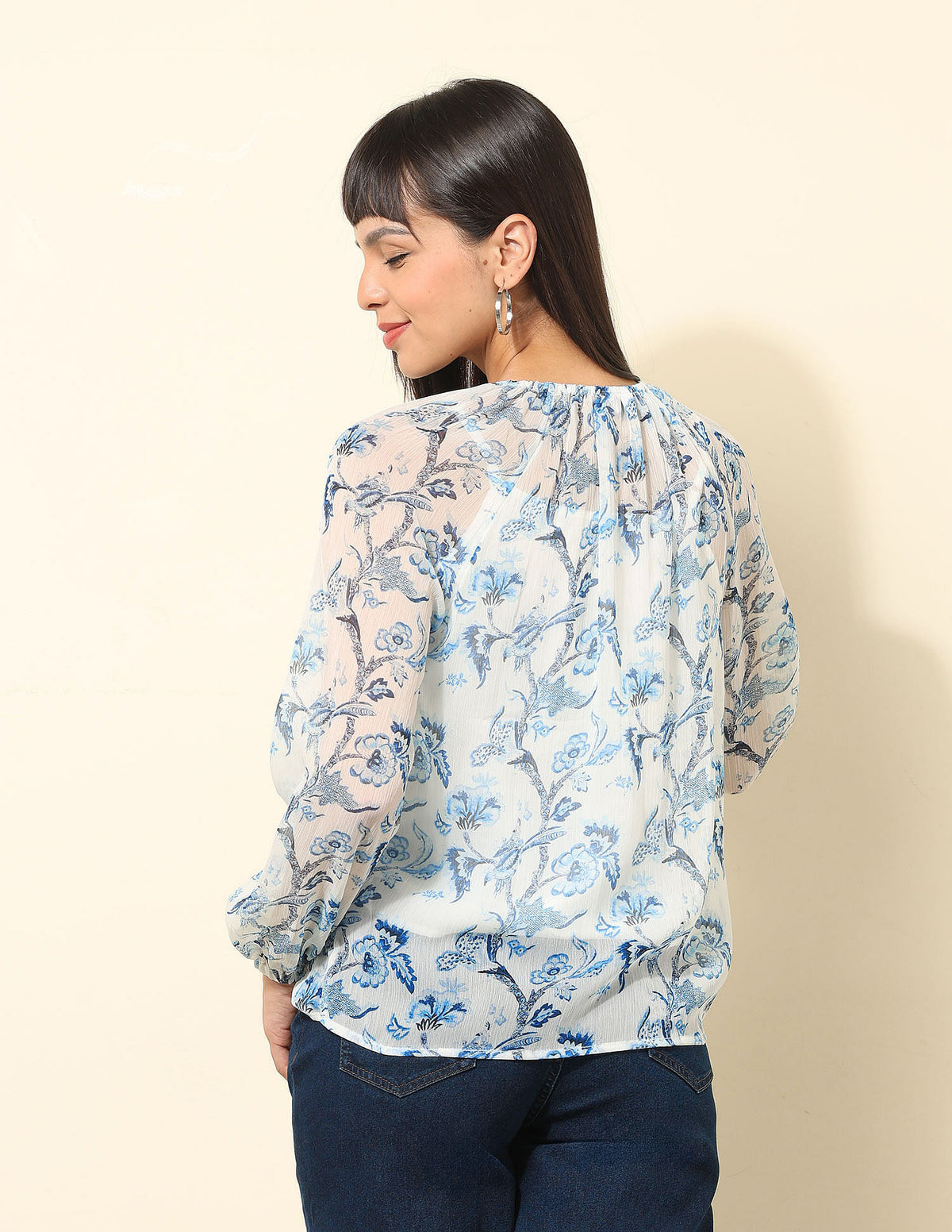| Round neck with tie-up closure | Gathered near yoke | Long sleeves with elasticized hems | Straight hemline | Floral printed pattern | Regular weave | Regular fit |