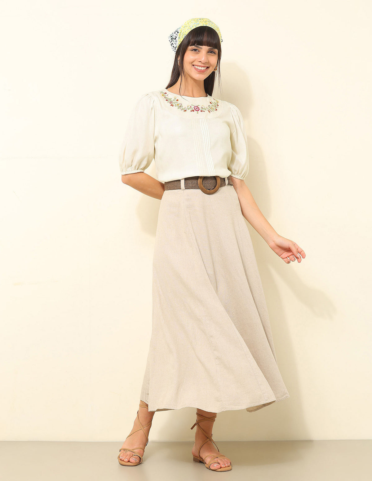 | Round neck | Gathered near yoke | Button and loop closure at back | Short sleeves with elasticized hems | Straight hemline | Floral embroidered pattern | Regular weave | Regular fit |