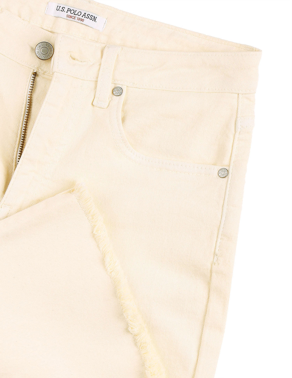 | High-rise waist | Button and zip fly closure | Five pockets | Denim weave | Extreme flared fit |
