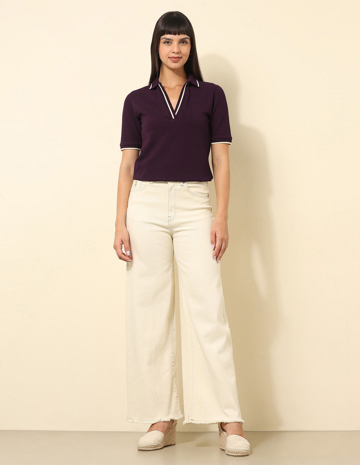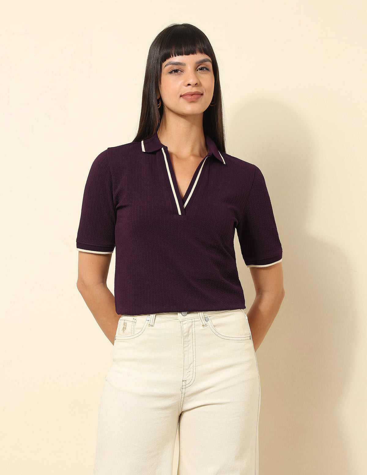 | Polo collar | Logo at chest | Open placket | Short sleeves | Ribbed collar and sleeve hems | Uneven vented hem | Solid pattern | Pique knit | Regular fit |