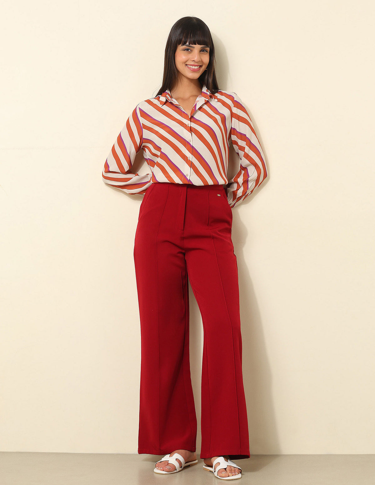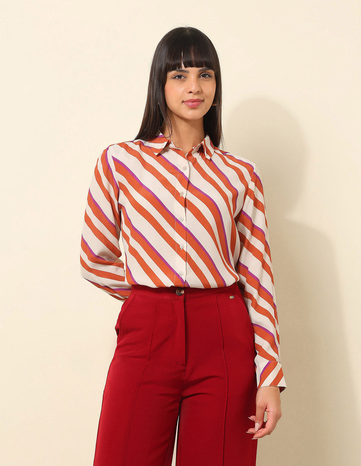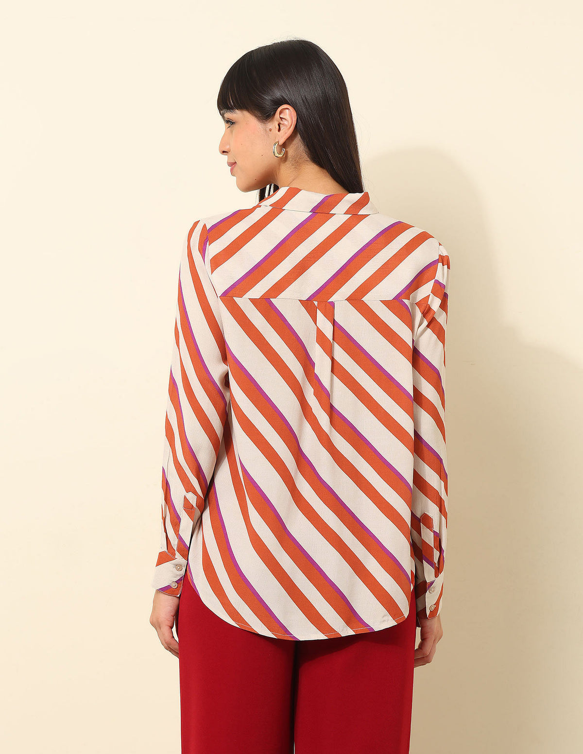 | Spread collar | Full button placket | Long sleeves with barrel cuffs | Curved hemline | Diagonal striped pattern | Twill weave | Regular fit |