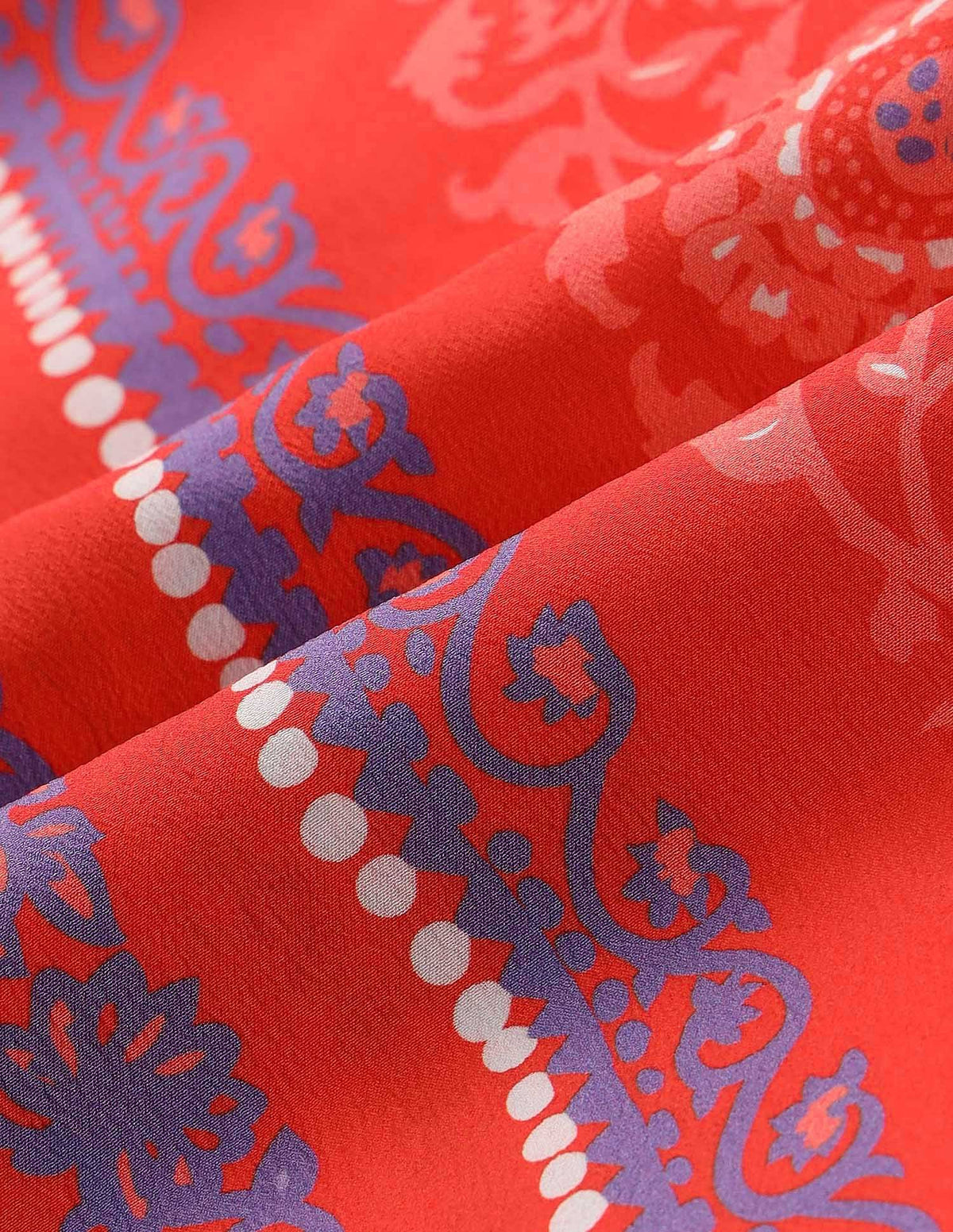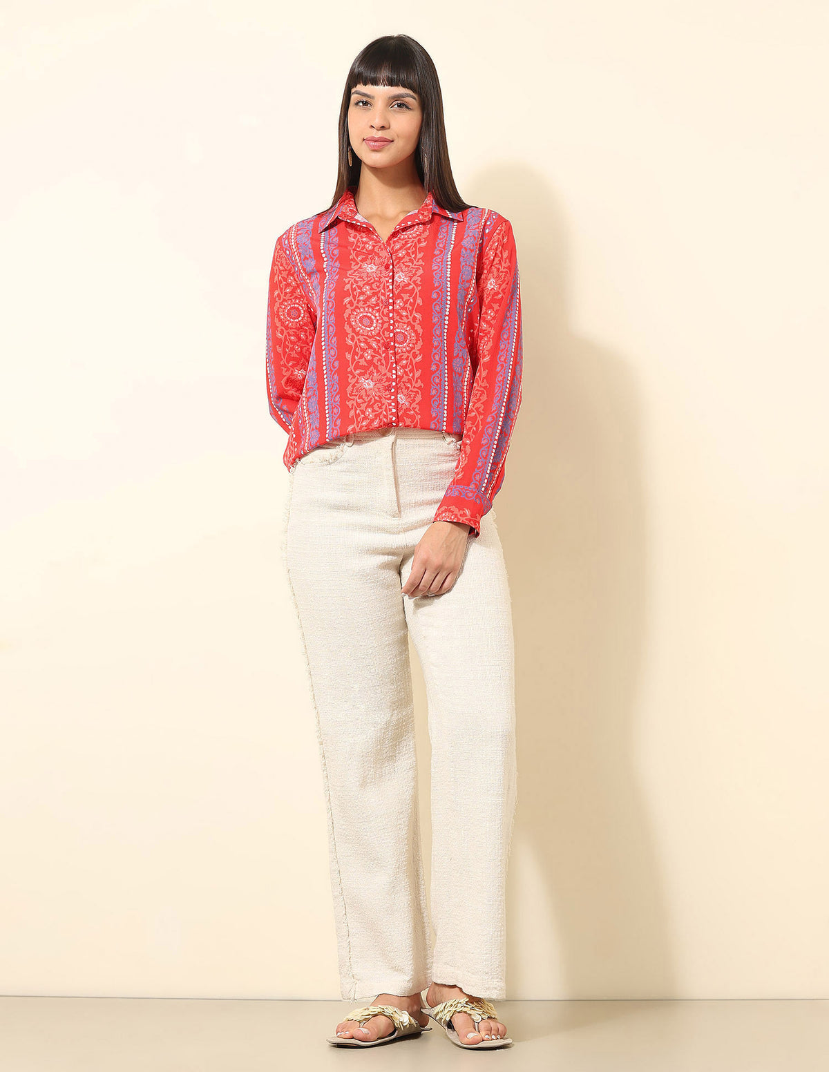 | Spread collar | Full button placket | Long sleeves with barrel cuffs | Curved hemline | Boho printed pattern | Twill weave | Relaxed fit |