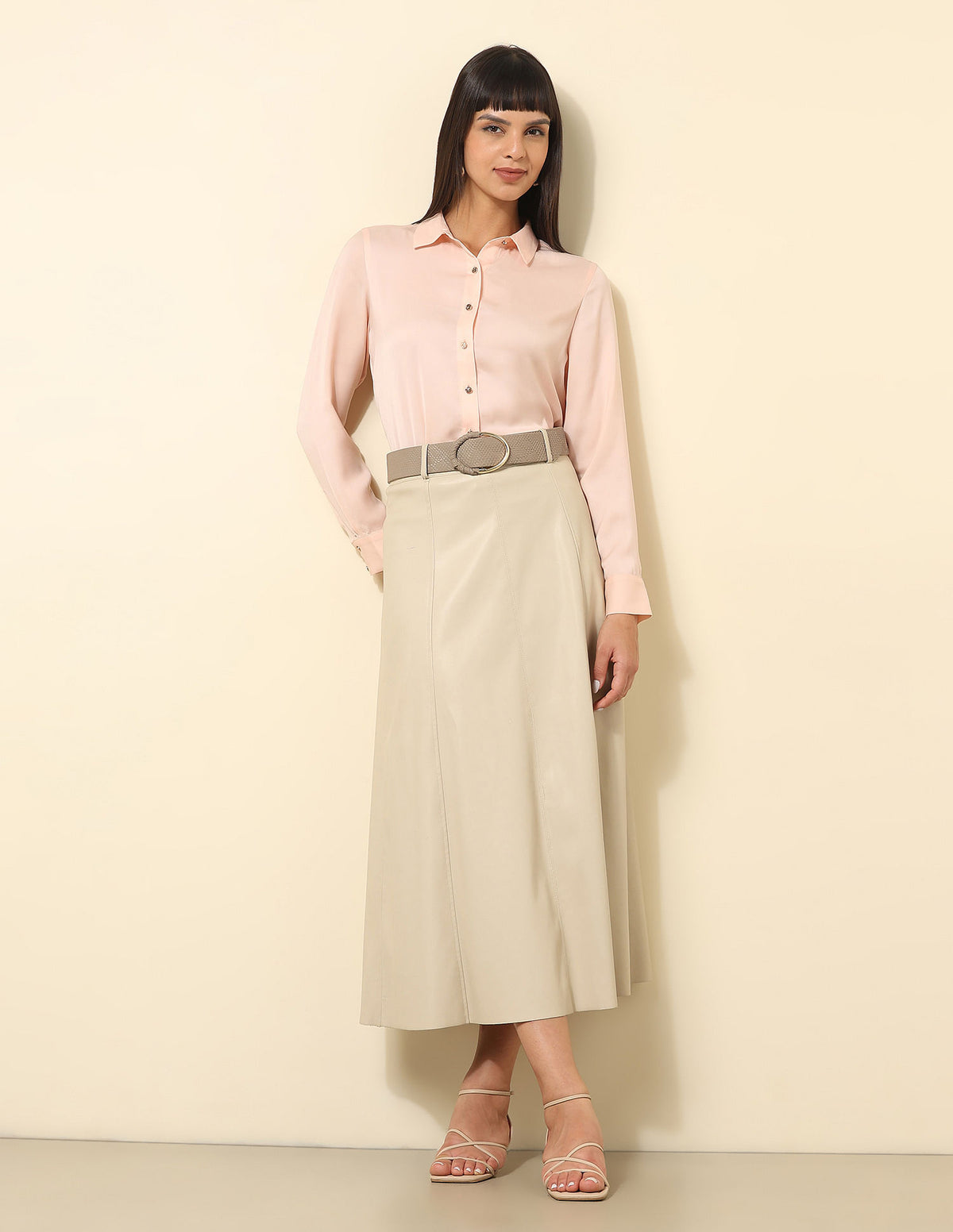 | Spread collar | Full button placket | Long sleeves with barrel cuffs | Curved hemline | Solid pattern | Satin weave | Regular fit |